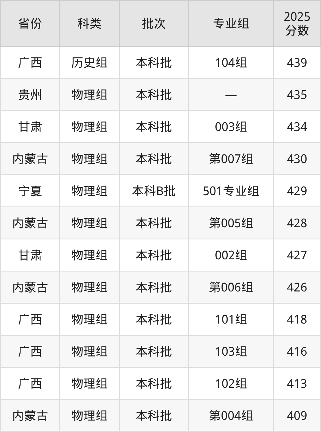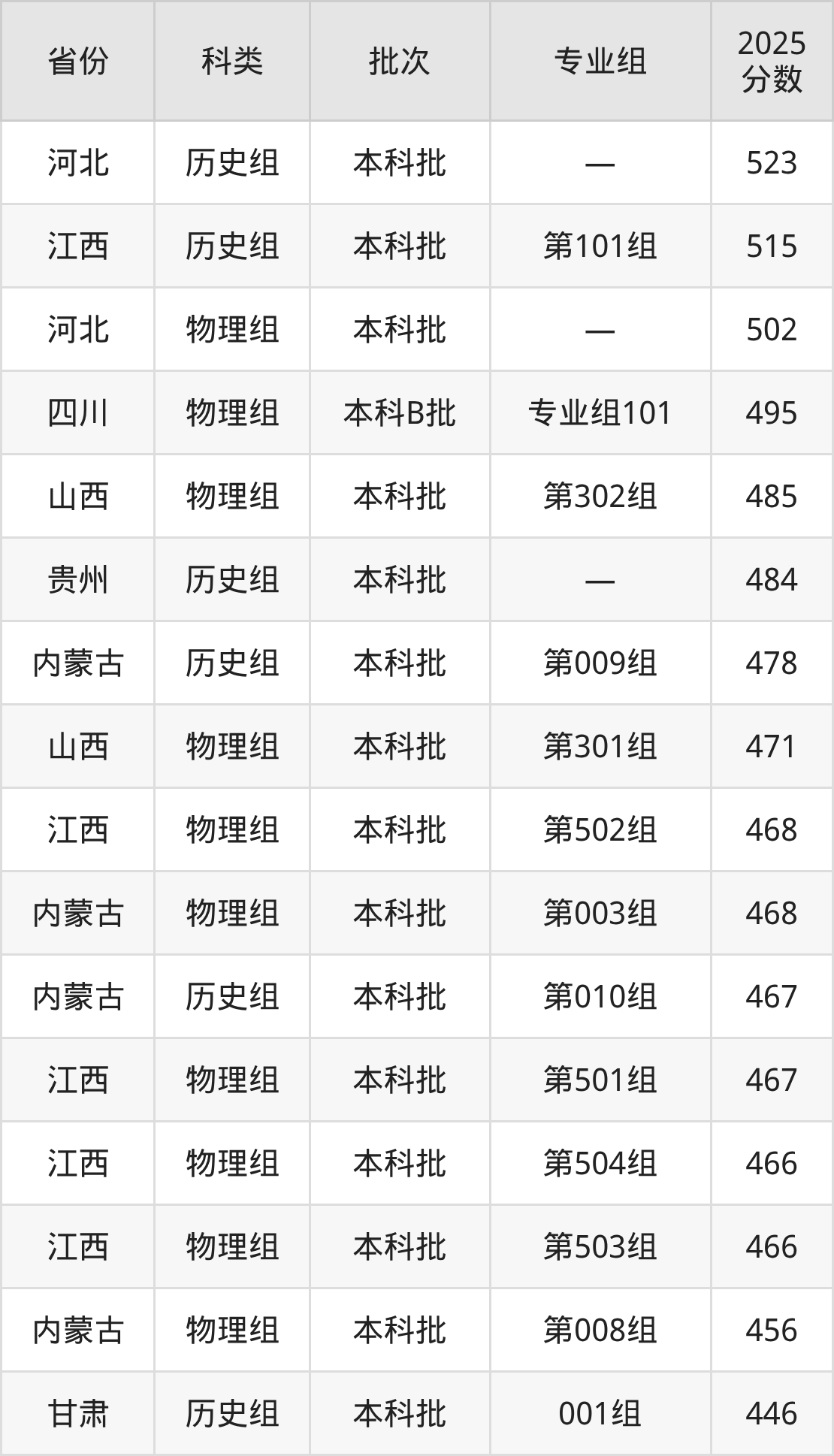 2025年鄂尔多斯应用技术学院在全国普通批次招生的录取分数范围位于409~523分之间,其中自治区内分数范围为409分~478分,历史组最低分专业组为“第010组”,考生467分即可报考,物理组最低分专业组为“第004组”,考生409分即可报考。