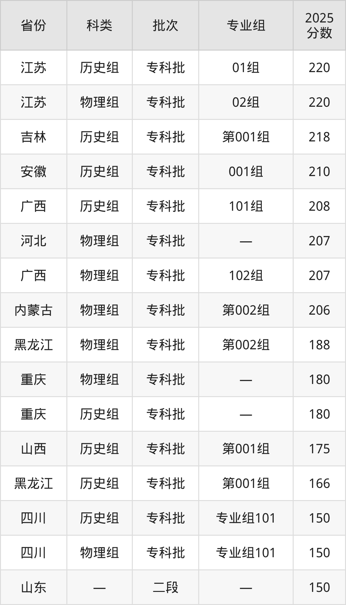 烟台黄金职业学院在省内招生最低录取分数线为150分,在省外招生最低录取分数线为150分,不同地区、不同科类的考生最低分有差异。