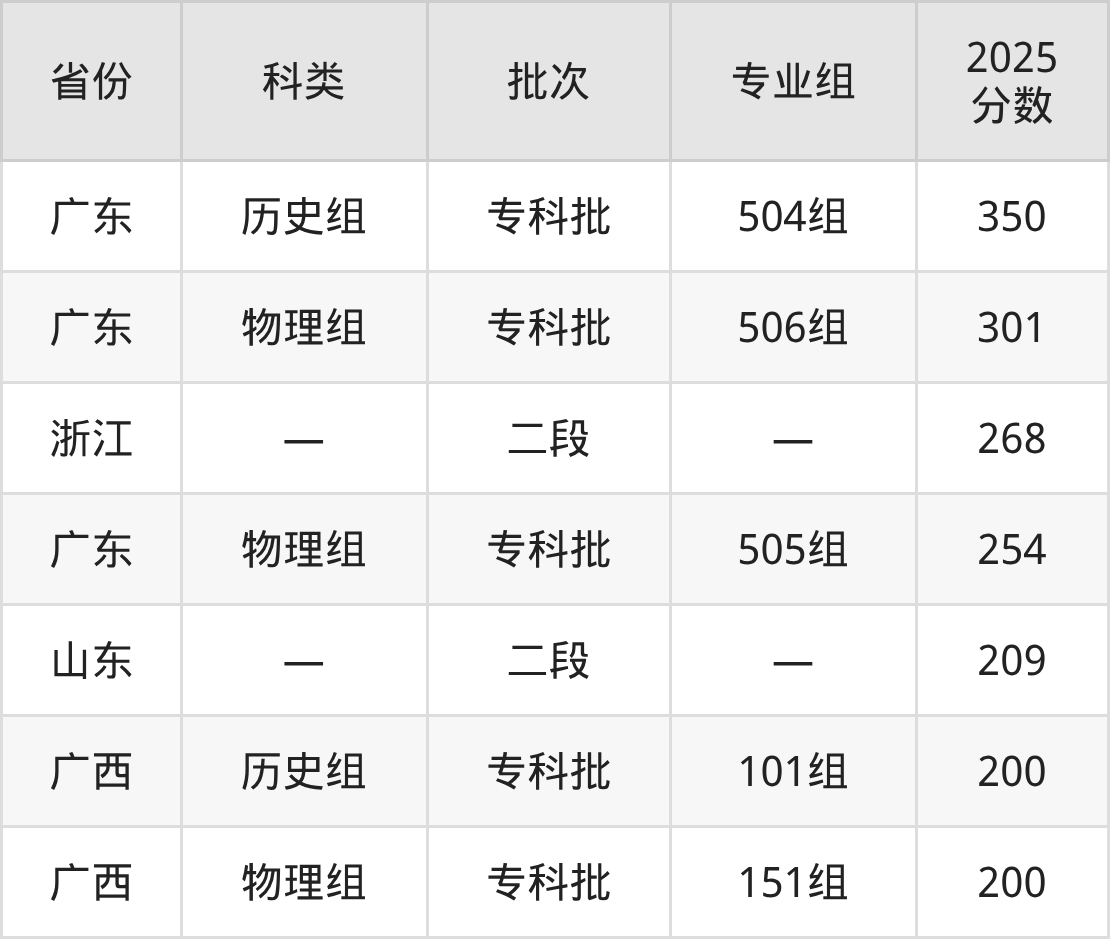而广东地区历史组考生的分数门槛最高,2025年广西工程职业学院504组在广东招生最低分为350分,考生至少要超专科线135分才有可能被录取。