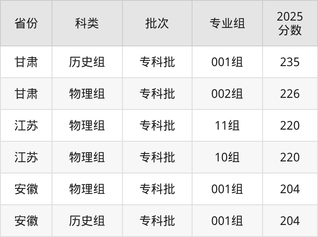 钟山职业技术学院在省外招生的最低分为204分,其中安徽地区物理组考生上钟山职业技术学院的分数门槛最低,考生成绩超专科线4分(204分)可上。其次是甘肃物理组考生,上钟山职业技术学院至少要超专科线46分(226分)。