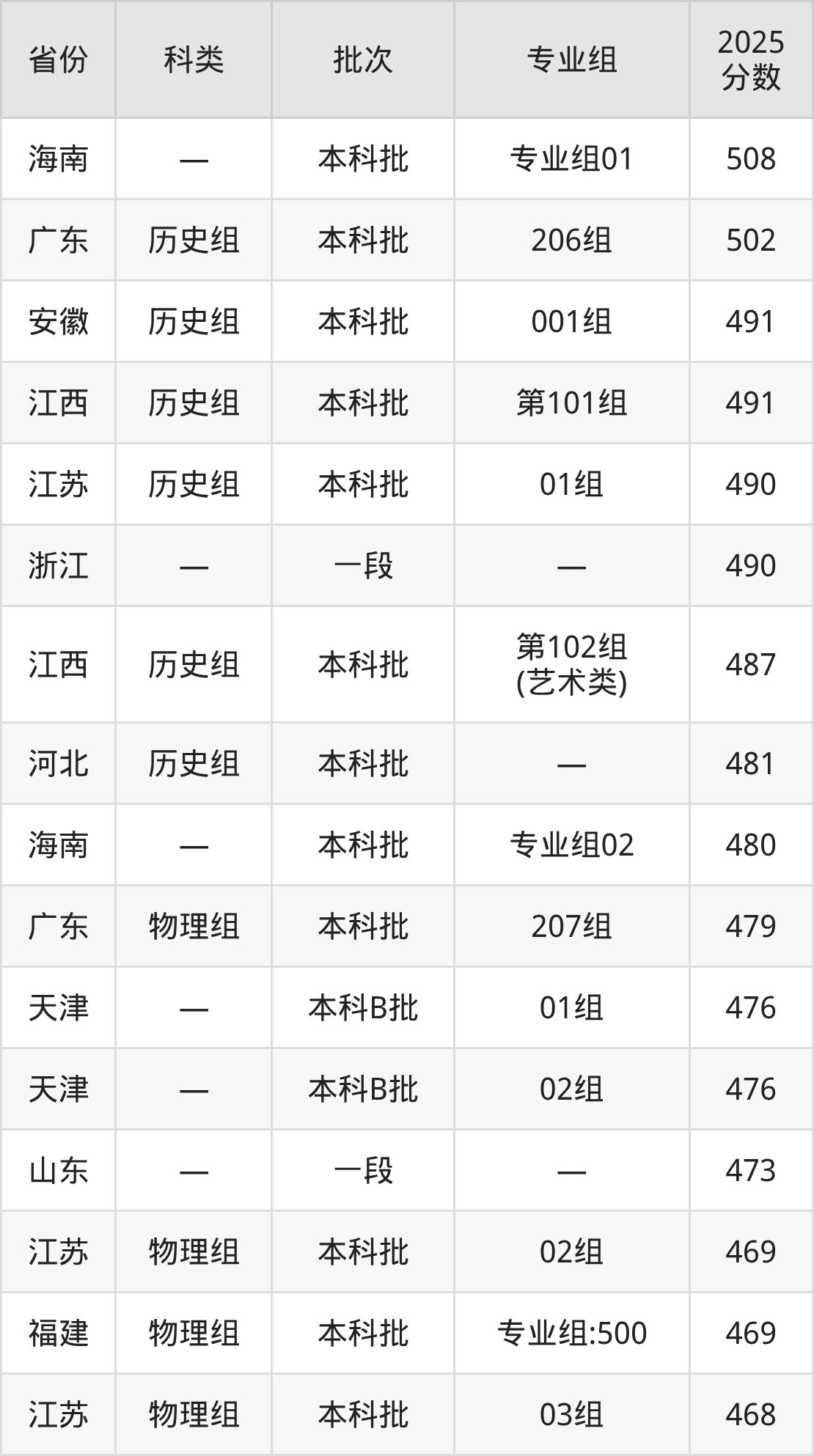 而海南地区考生的分数门槛最高,2025年长春人文学院专业组01在海南招生最低分为508分,考生至少要超本科线28分才有可能被录取。