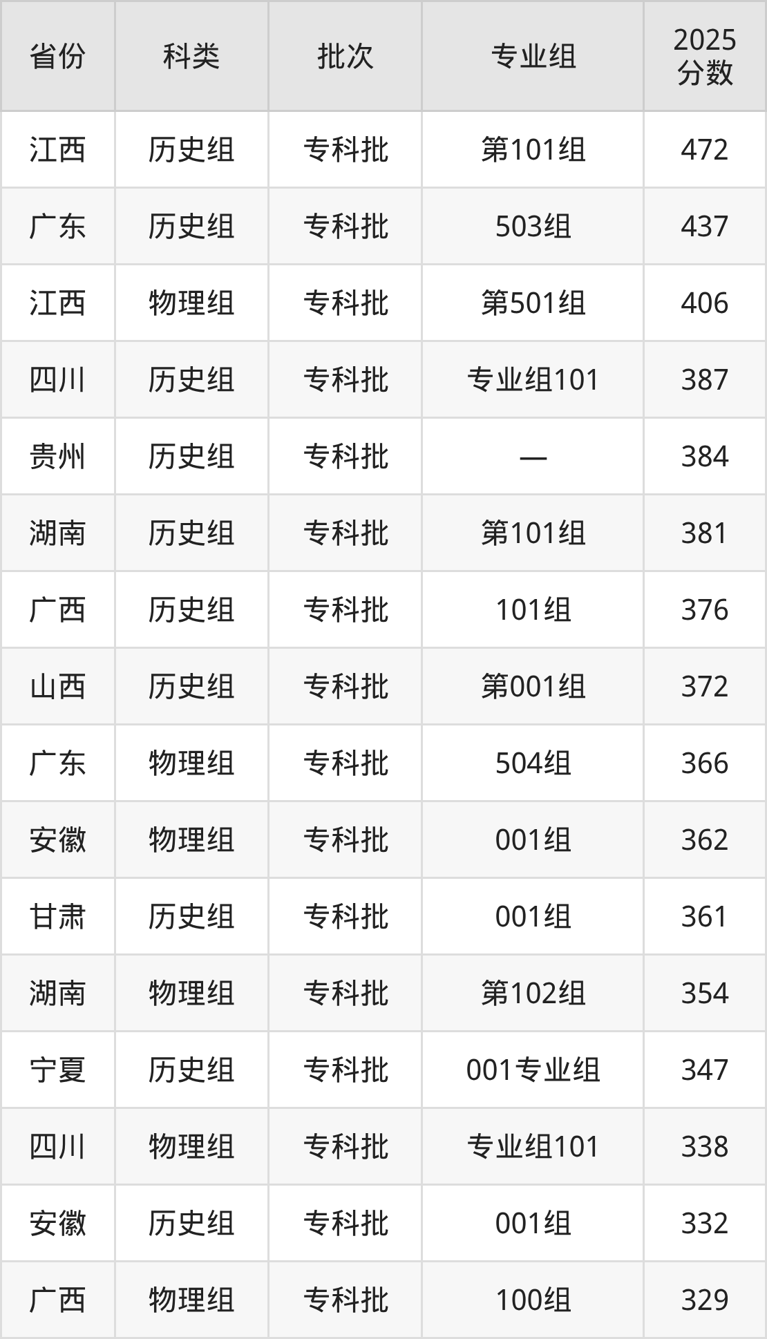 而江西地区历史组考生的分数门槛最高,2025年漳州城市职业学院第101组在江西招生最低分为472分,考生至少要超专科线182分才有可能被录取。