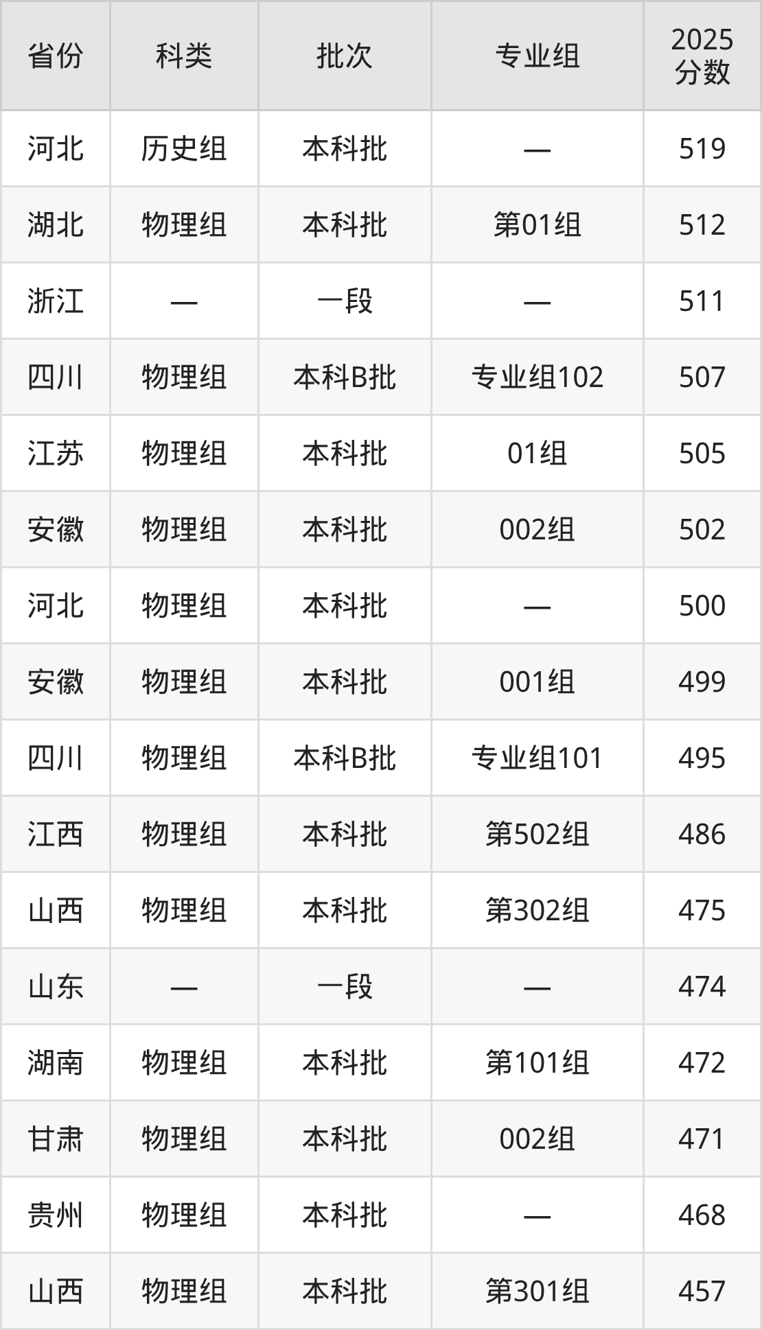而湖北地区物理组考生的分数门槛最高,2025年河北水利电力学院第01组在湖北招生最低分为512分,考生至少要超本科线86分才有可能被录取。