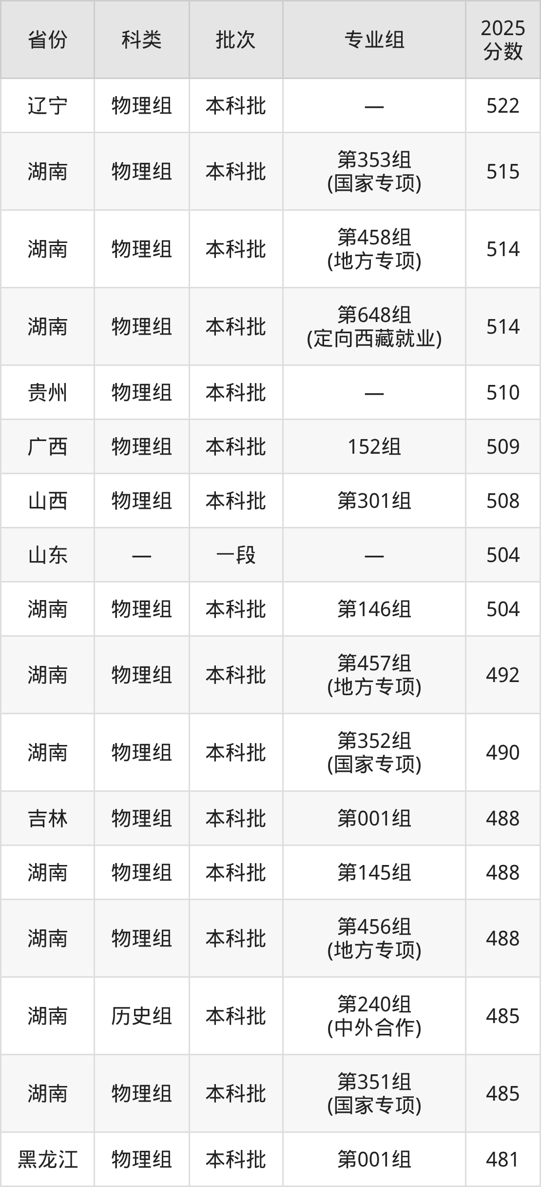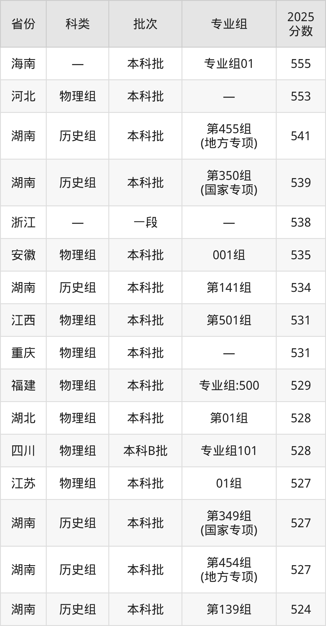 而海南地区考生的分数门槛最高,2025年湖南第一师范学院专业组01在海南招生最低分为555分,考生至少要超本科线75分才有可能被录取。