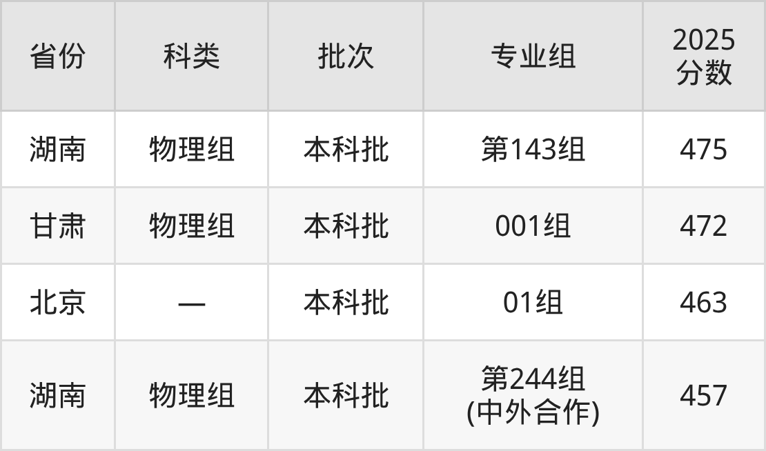 2025年湖南第一师范学院在全国普通批次招生的录取分数范围位于457~555分之间,其中省内分数范围为457分~541分,历史组最低分专业组为“第240组(中外合作)”,考生485分即可报考,物理组最低分专业组为“第244组(中外合作)”,考生457分即可报考。