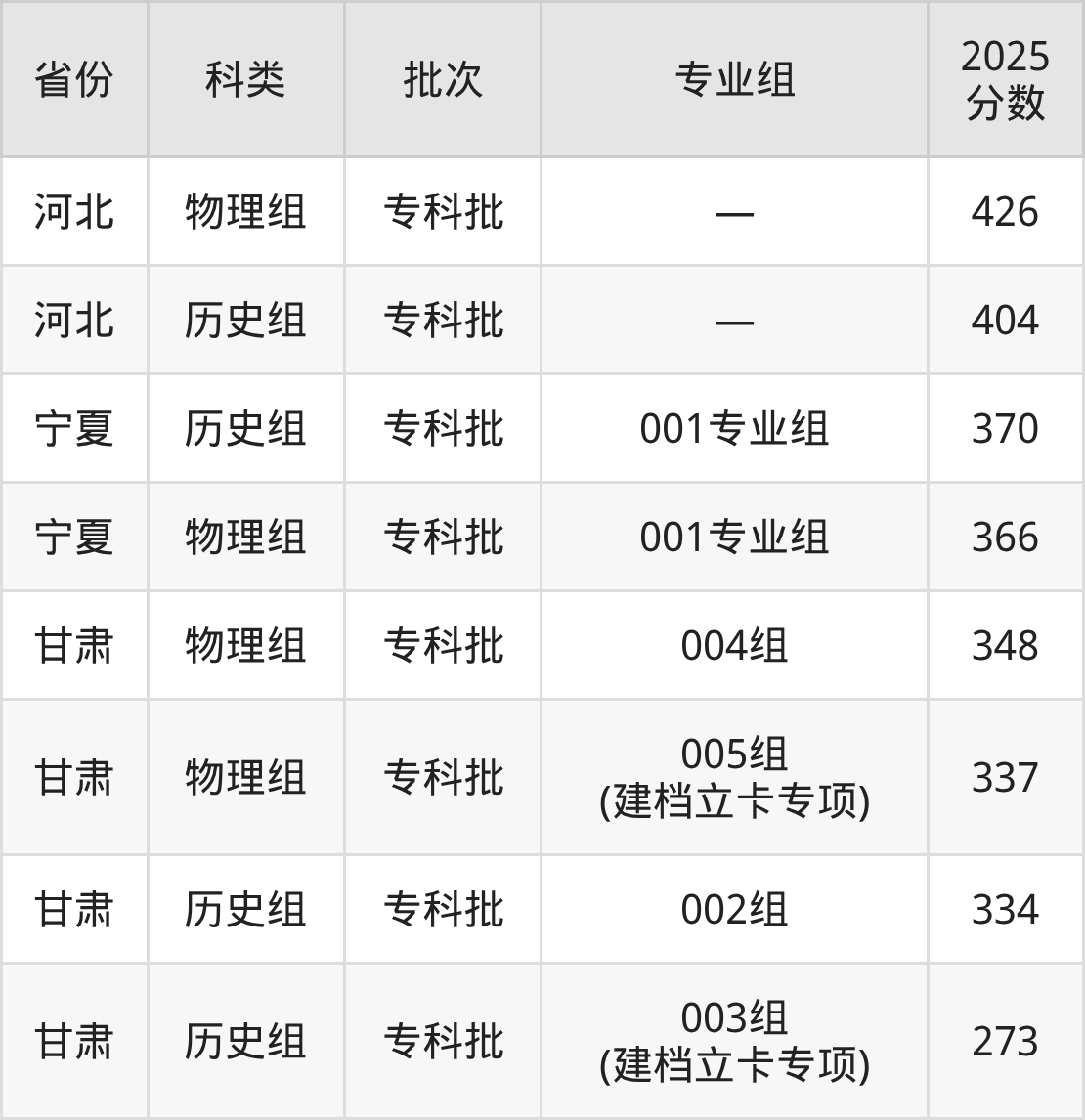 2025年兰州航空职业技术学院在全国普通批次招生的录取分数范围位于273~426分之间,其中省内分数范围为273分~348分,物理组最低分专业组为“005组(建档立卡专项)”,考生337分即可报考,历史组最低分专业组为“003组(建档立卡专项)”,考生273分即可报考。