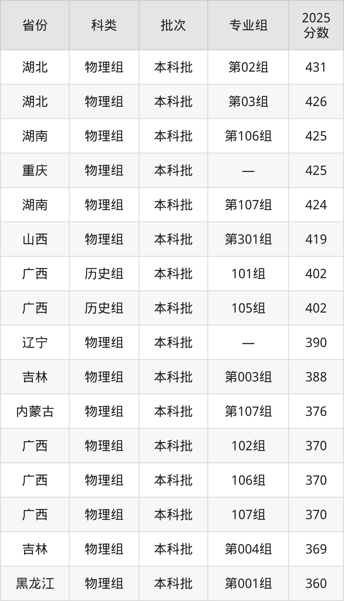 2025年南宁理工学院在全国普通批次招生的录取分数范围位于360~527分之间,其中壮族自治区内分数范围为370分~402分,历史组最低分专业组为“101组”,考生402分即可报考,物理组最低分专业组为“102组”,考生370分即可报考。