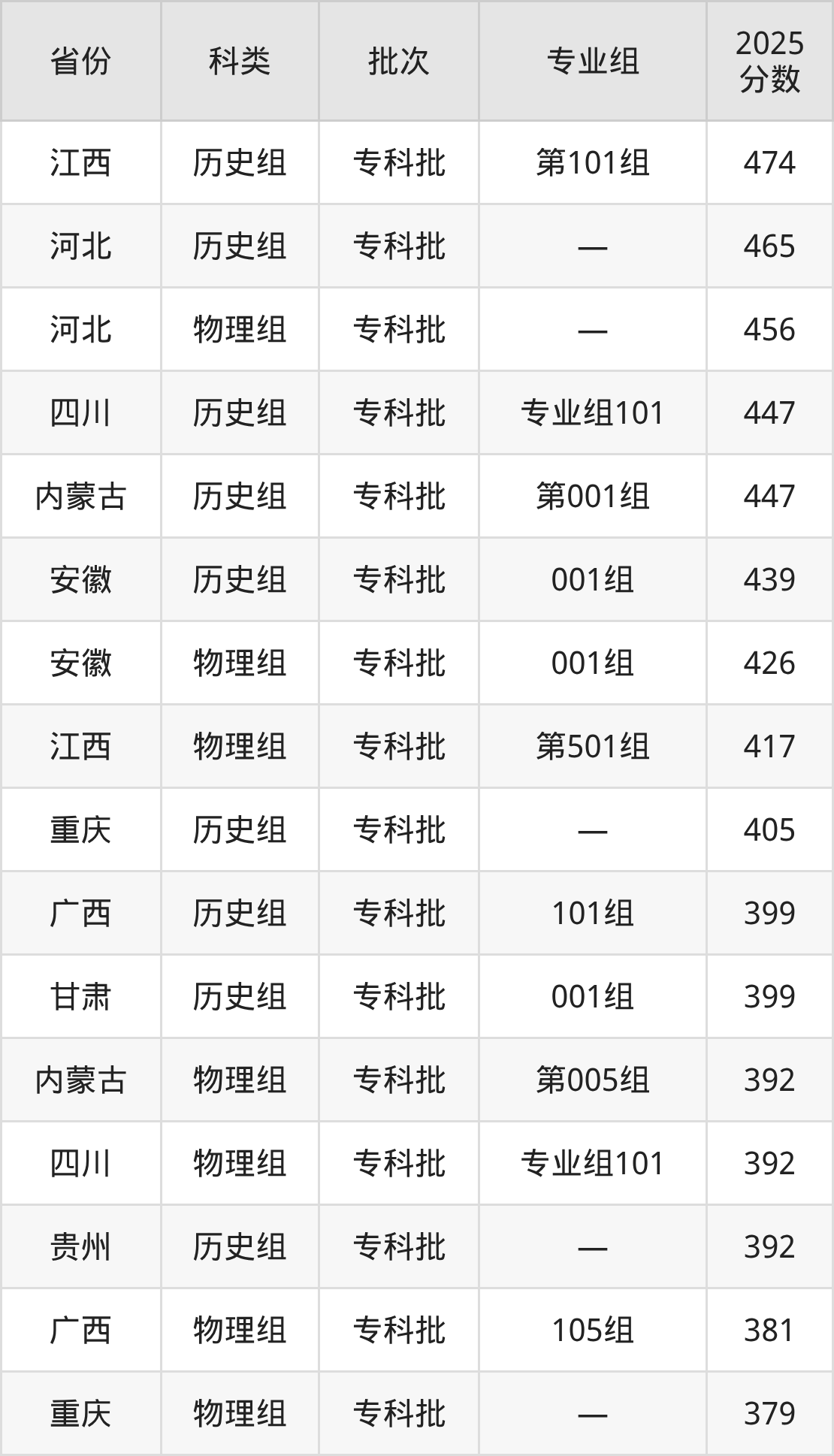 而江西地区历史组考生的分数门槛最高,2025年运城护理职业学院第101组在江西招生最低分为474分,考生至少要超专科线184分才有可能被录取。