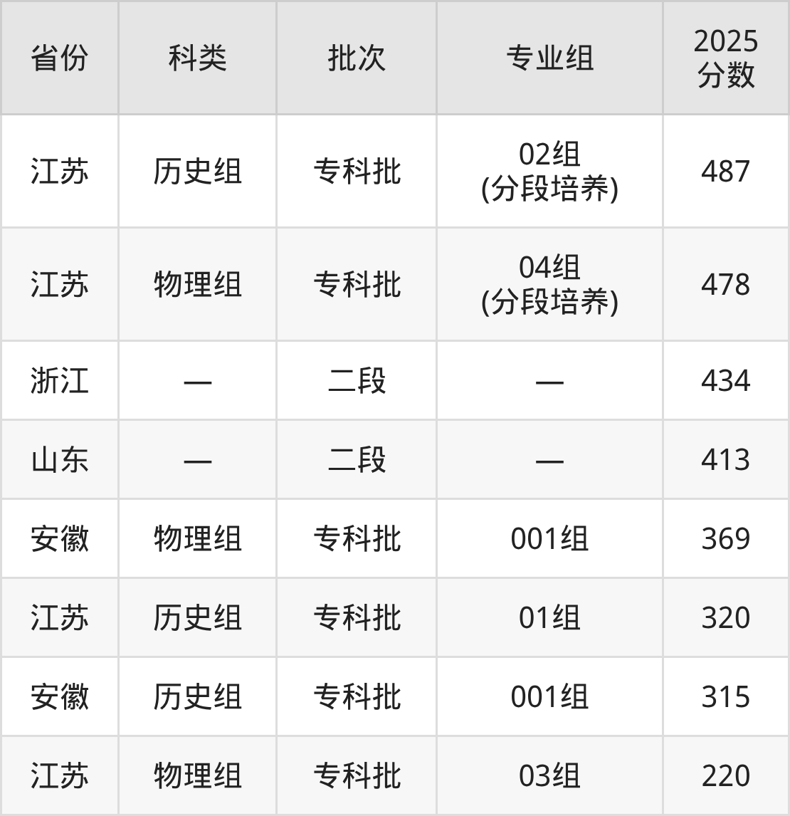 下面是无锡师范高等专科学校2025年在全国各省的录取分数线一览表,供参考: