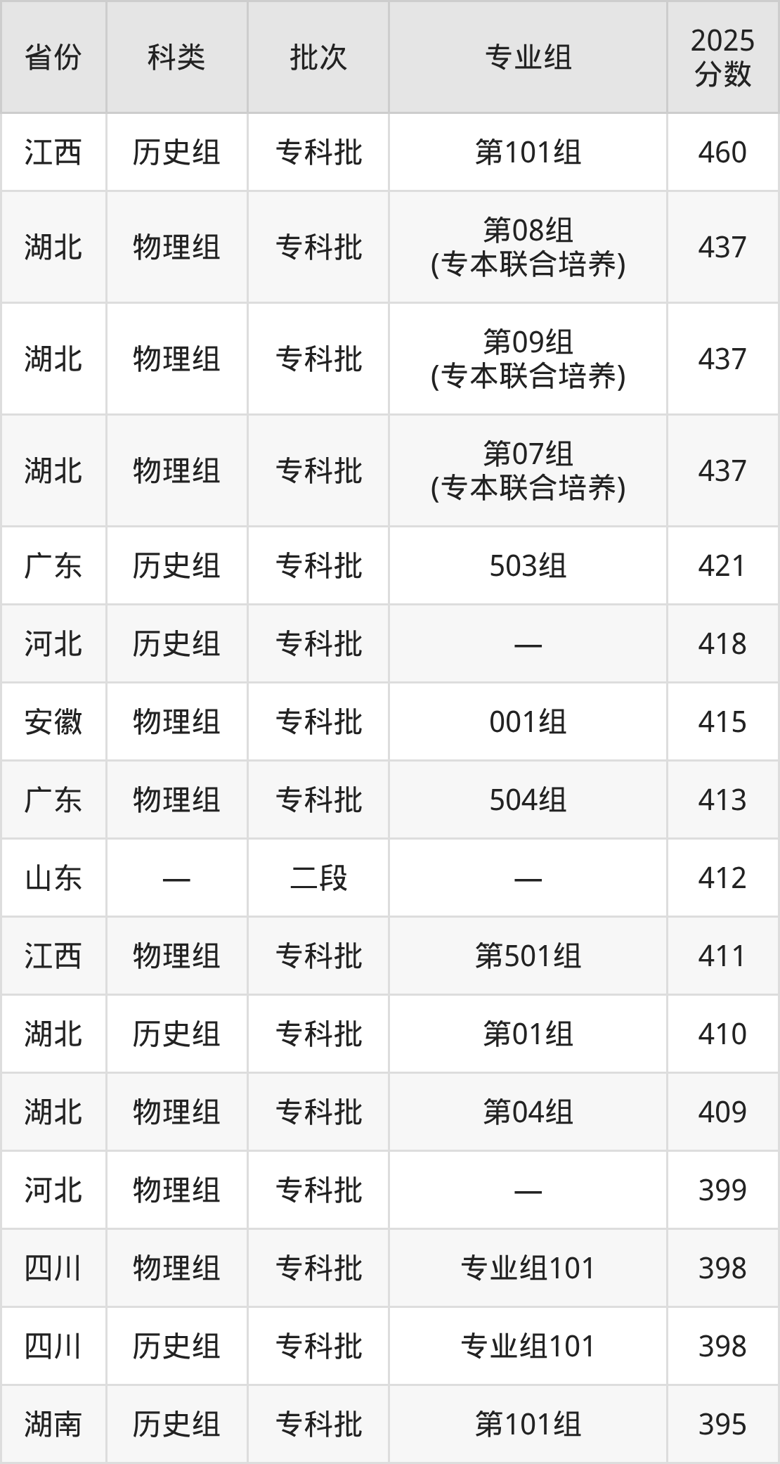 而江西地区历史组考生的分数门槛最高,2025年湖北科技职业学院第101组在江西招生最低分为460分,考生至少要超专科线170分才有可能被录取。
