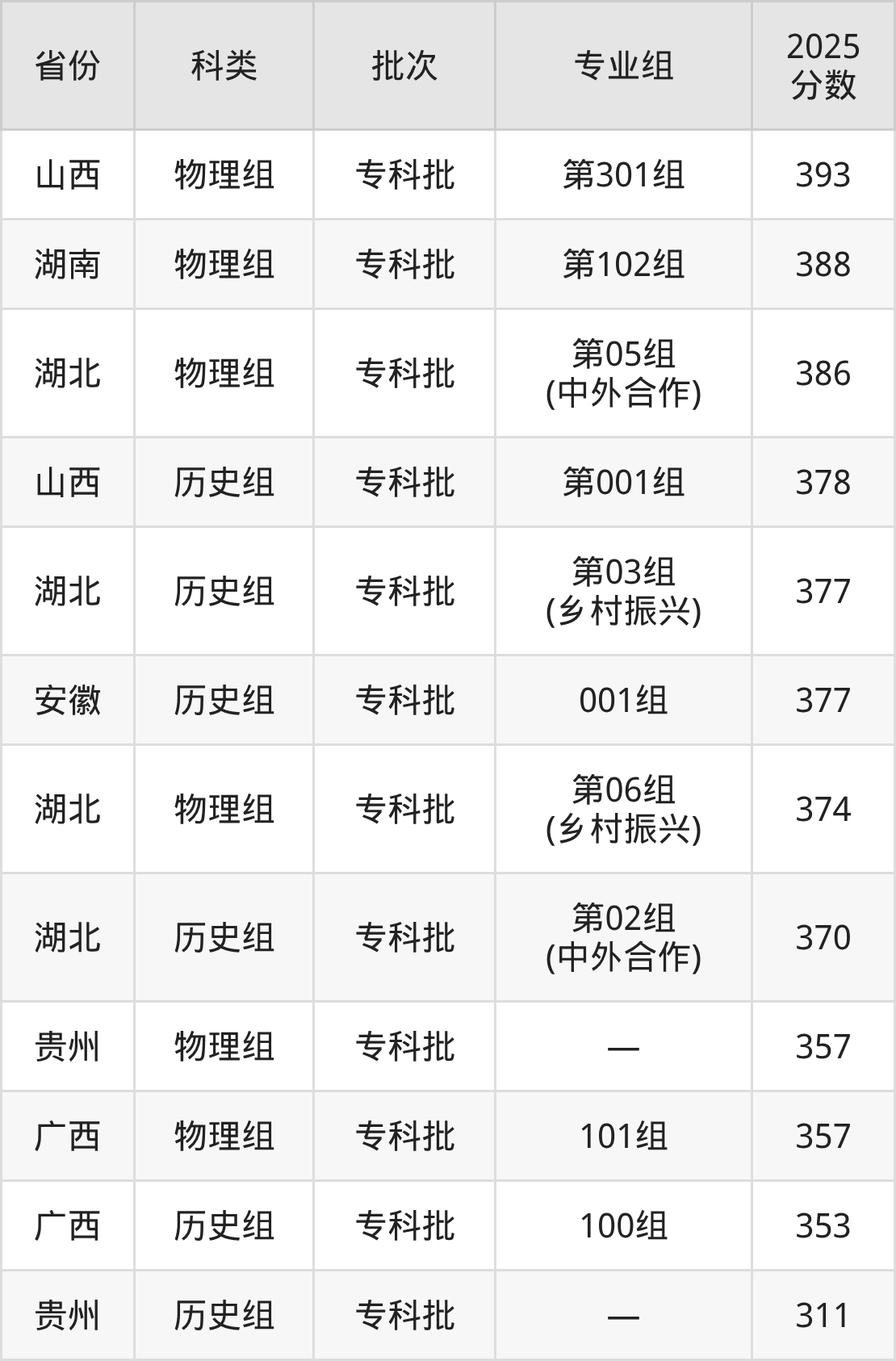 下面是湖北科技职业学院2025年在全国各省的录取分数线一览表,供参考: