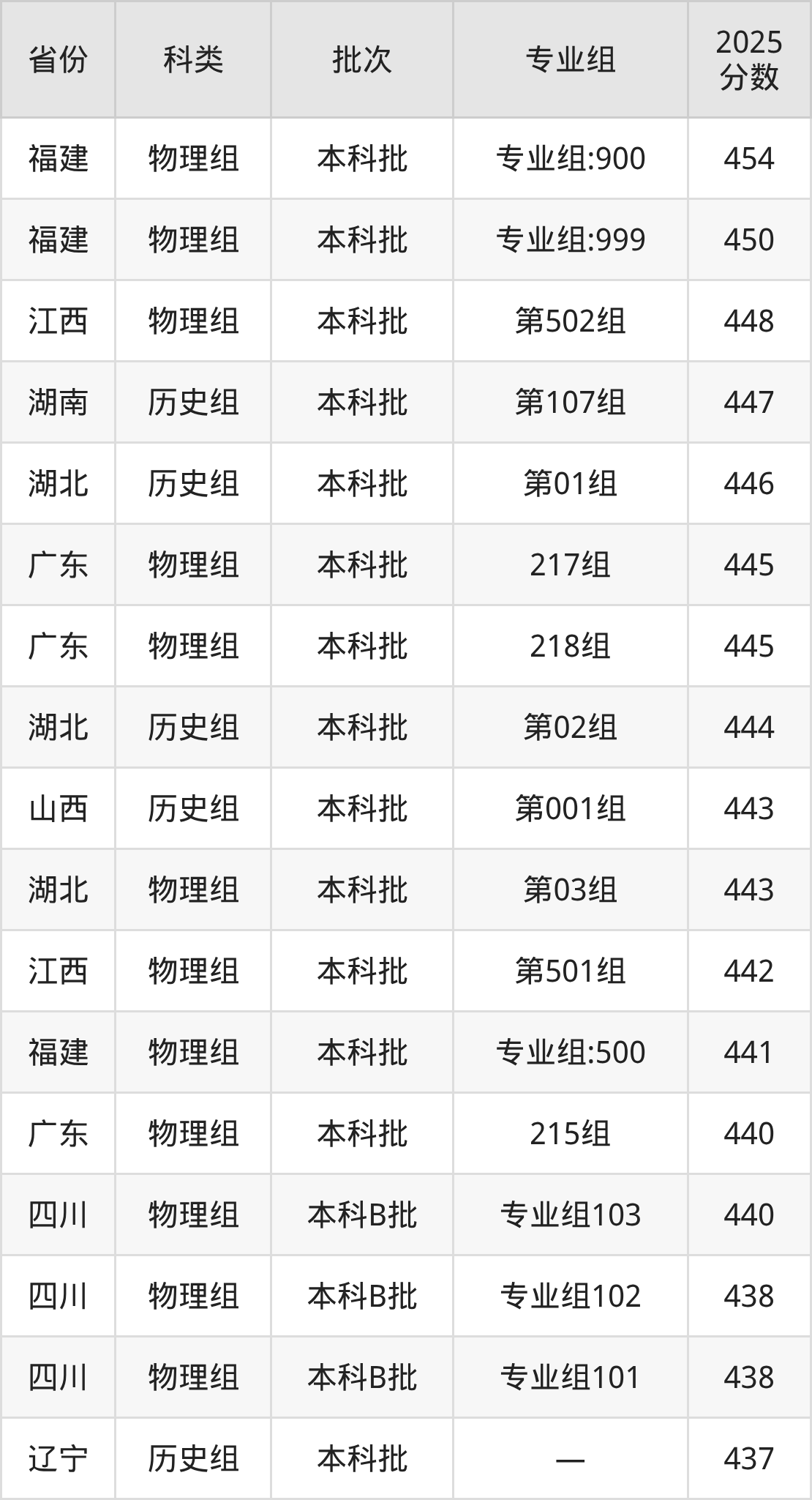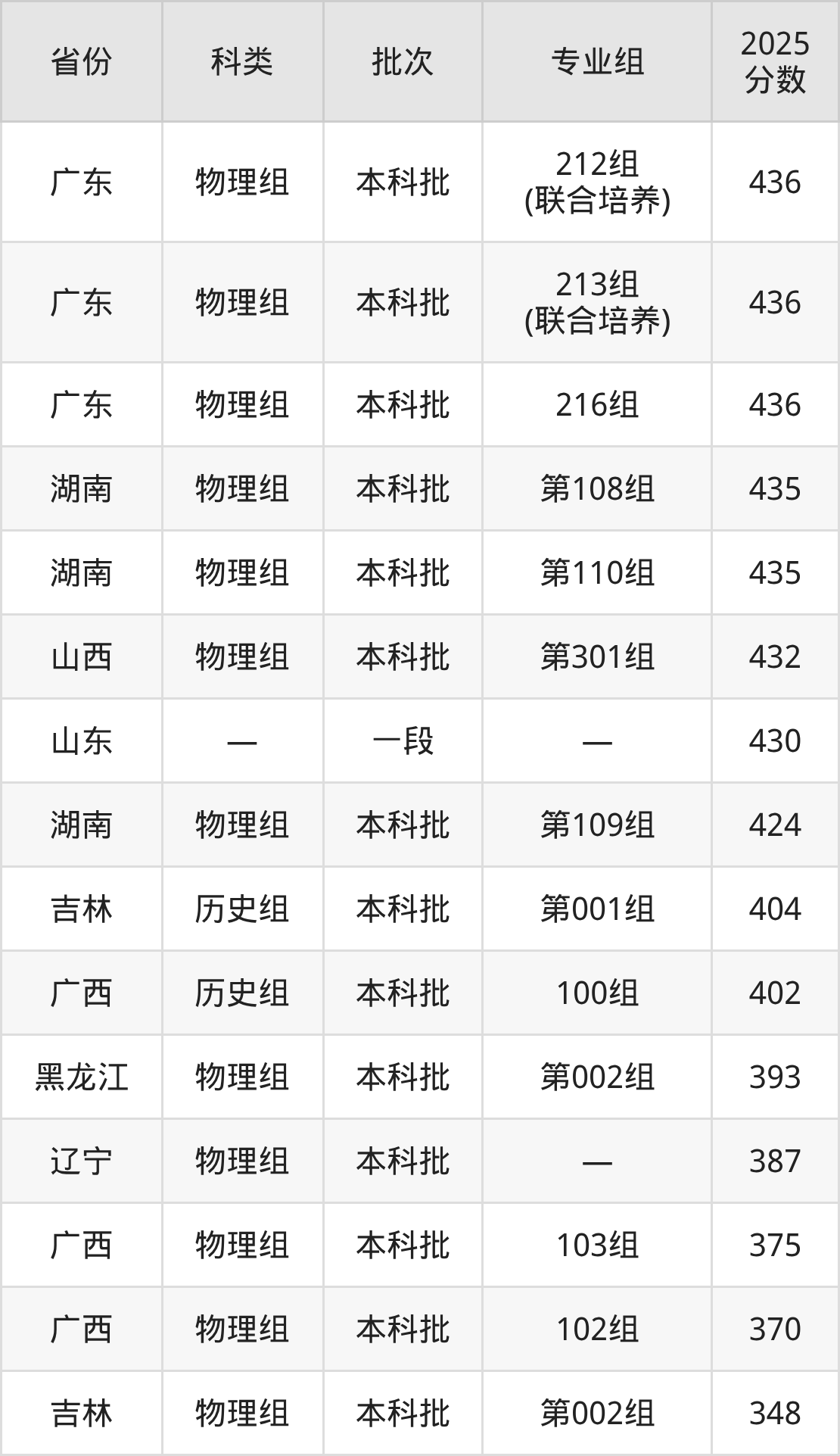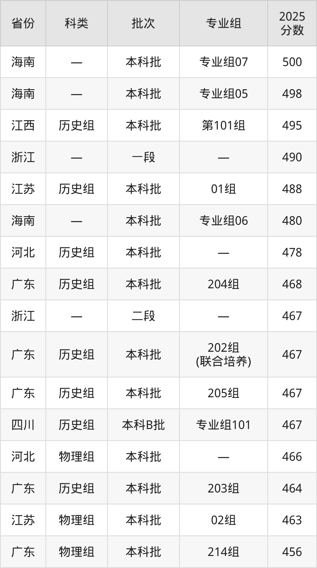 2025年东莞城市学院在全国普通批次招生的录取分数范围位于348~500分之间,其中省内分数范围为436分~468分,物理组最低分专业组为“212组(联合培养)”,考生436分即可报考,历史组最低分专业组为“203组”,考生464分即可报考。