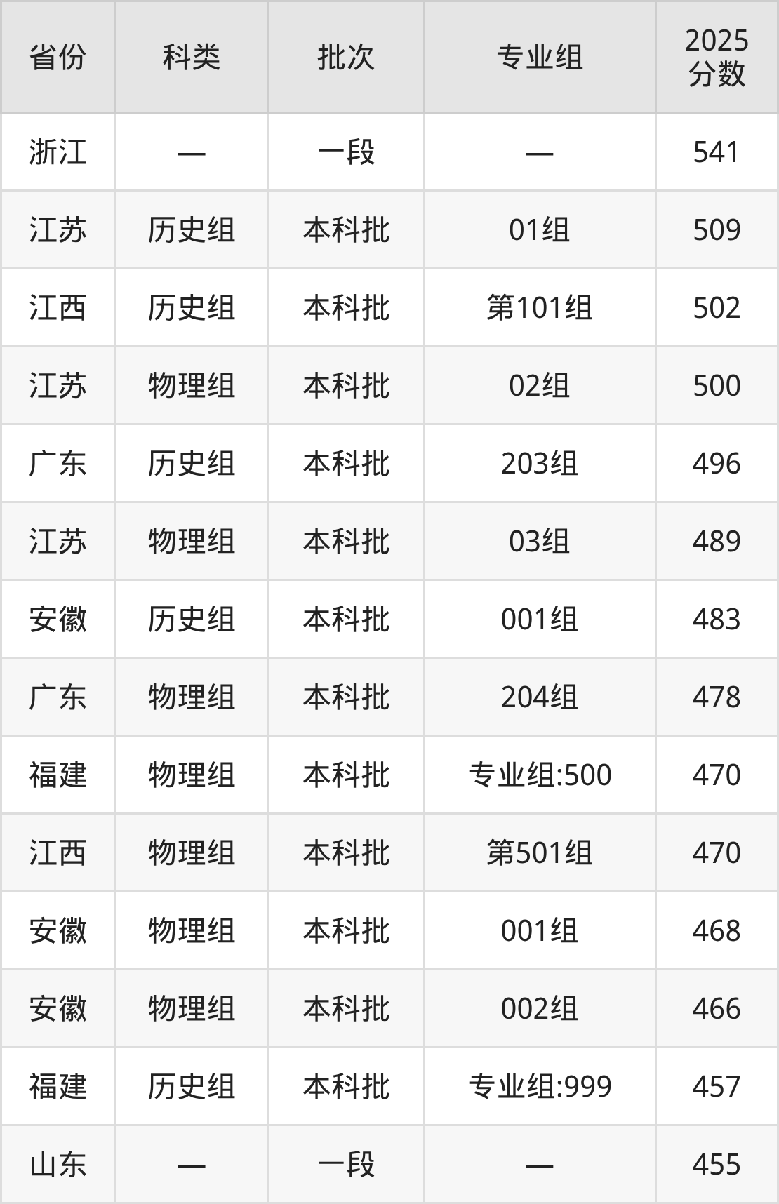 2025年马鞍山学院在全国普通批次招生的录取分数范围位于455~541分之间,其中省内分数范围为466分~483分,历史组最低分专业组为“001组”,考生483分即可报考,物理组最低分专业组为“002组”,考生466分即可报考。