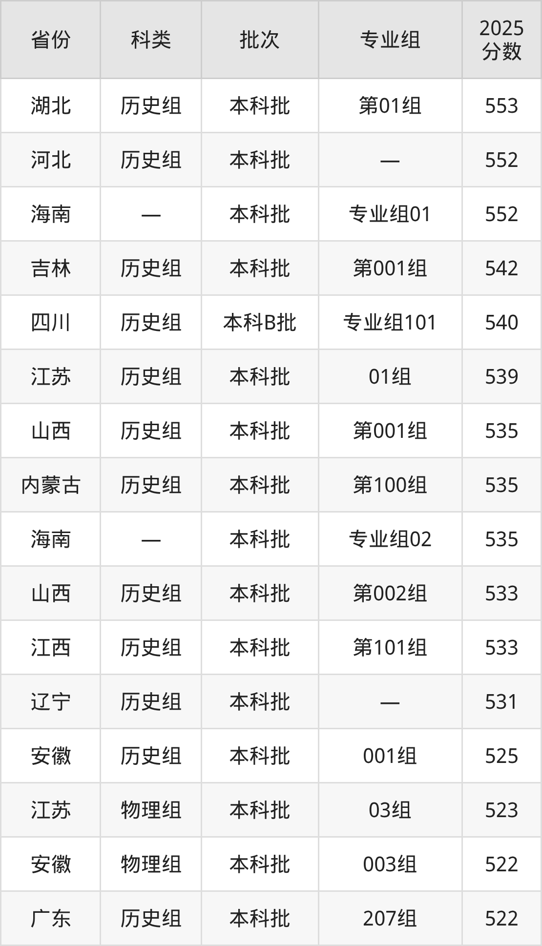 而湖北地区历史组考生的分数门槛最高,2025年哈尔滨商业大学第01组在湖北招生最低分为553分,考生至少要超本科线111分才有可能被录取。
