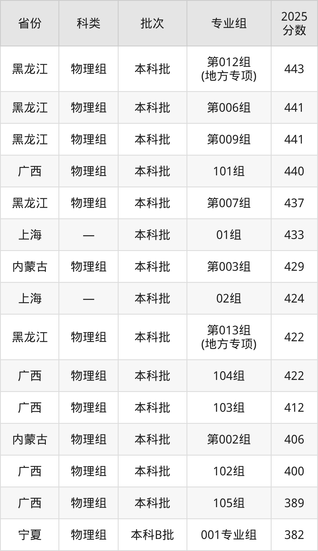 哈尔滨商业大学在省外招生的最低分为382分,其次是广西物理组考生,上哈尔滨商业大学至少要超本科线19分(389分)。