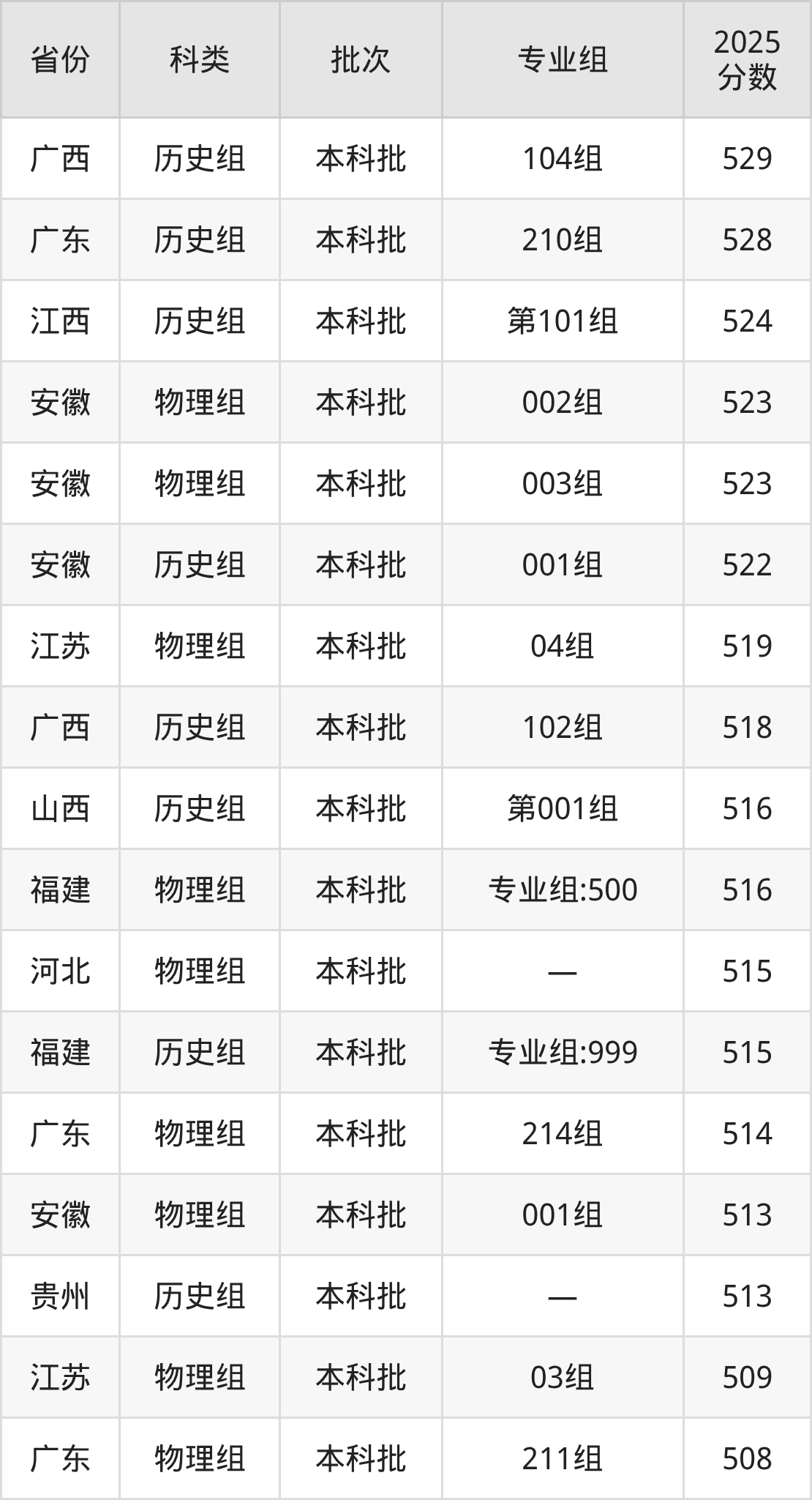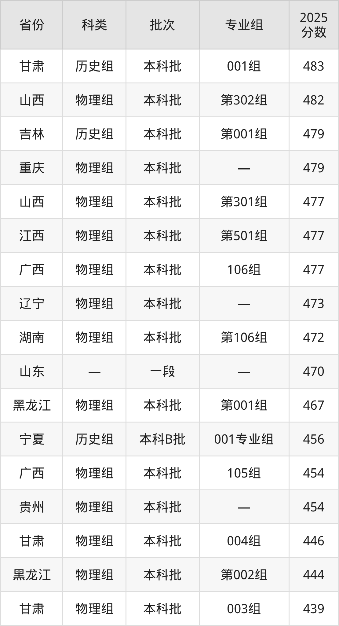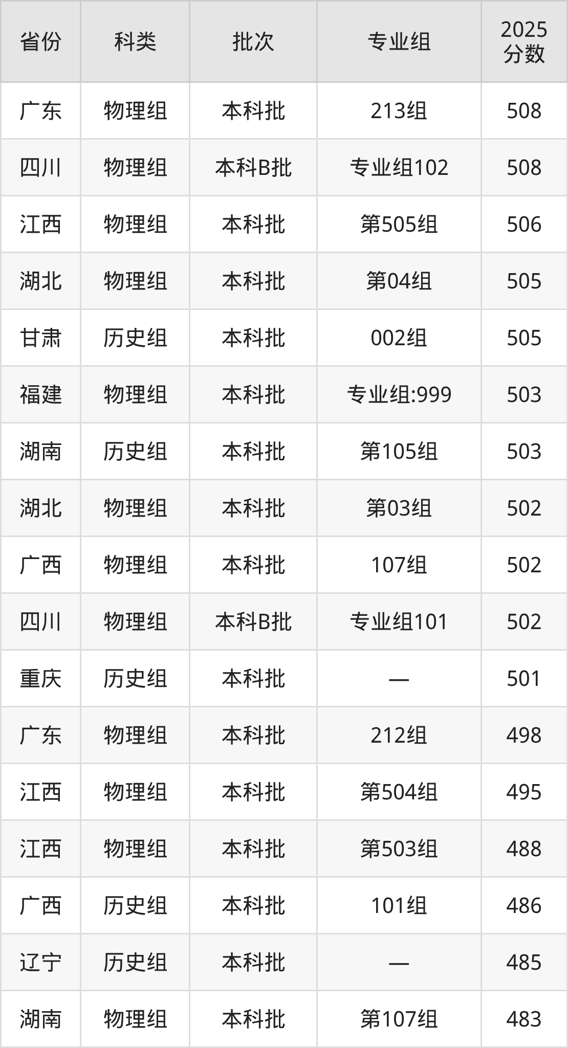 2025年南昌师范学院在全国普通批次招生的录取分数范围位于430~575分之间,其中省内分数范围为477分~538分,历史组最低分专业组为“第101组”,考生524分即可报考,物理组最低分专业组为“第501组”,考生477分即可报考。