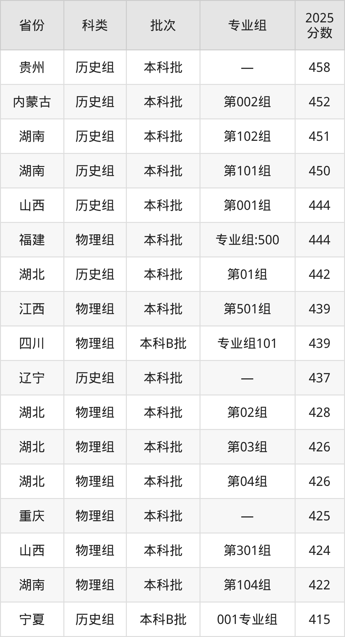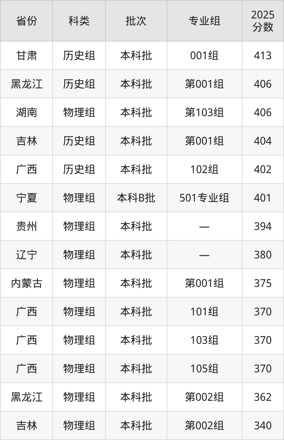 2025年柳州工学院在全国普通批次招生的录取分数范围位于340~519分之间,其中壮族自治区内分数范围为370分~402分,历史组最低分专业组为“102组”,考生402分即可报考,物理组最低分专业组为“101组”,考生370分即可报考。