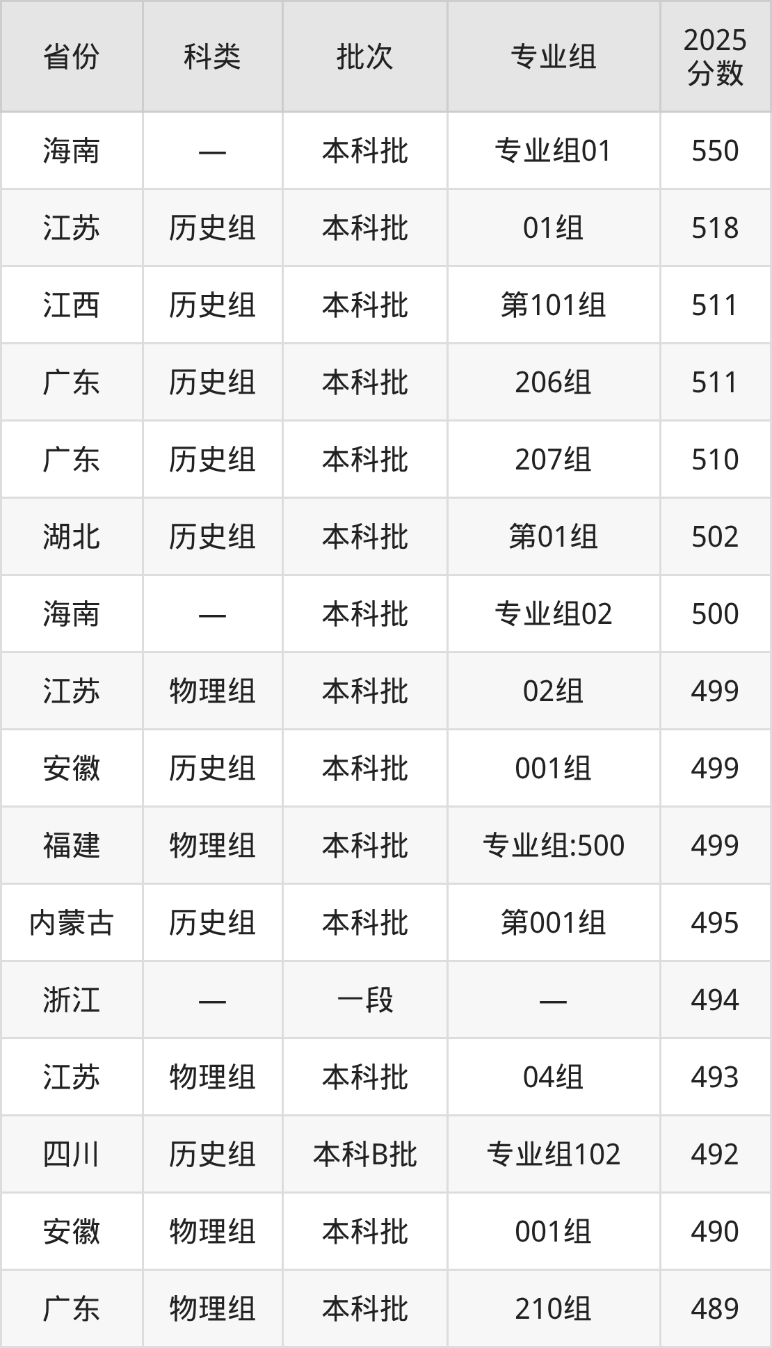 而海南地区考生的分数门槛最高,2025年扬州大学广陵学院专业组01在海南招生最低分为550分,考生至少要超本科线70分才有可能被录取。