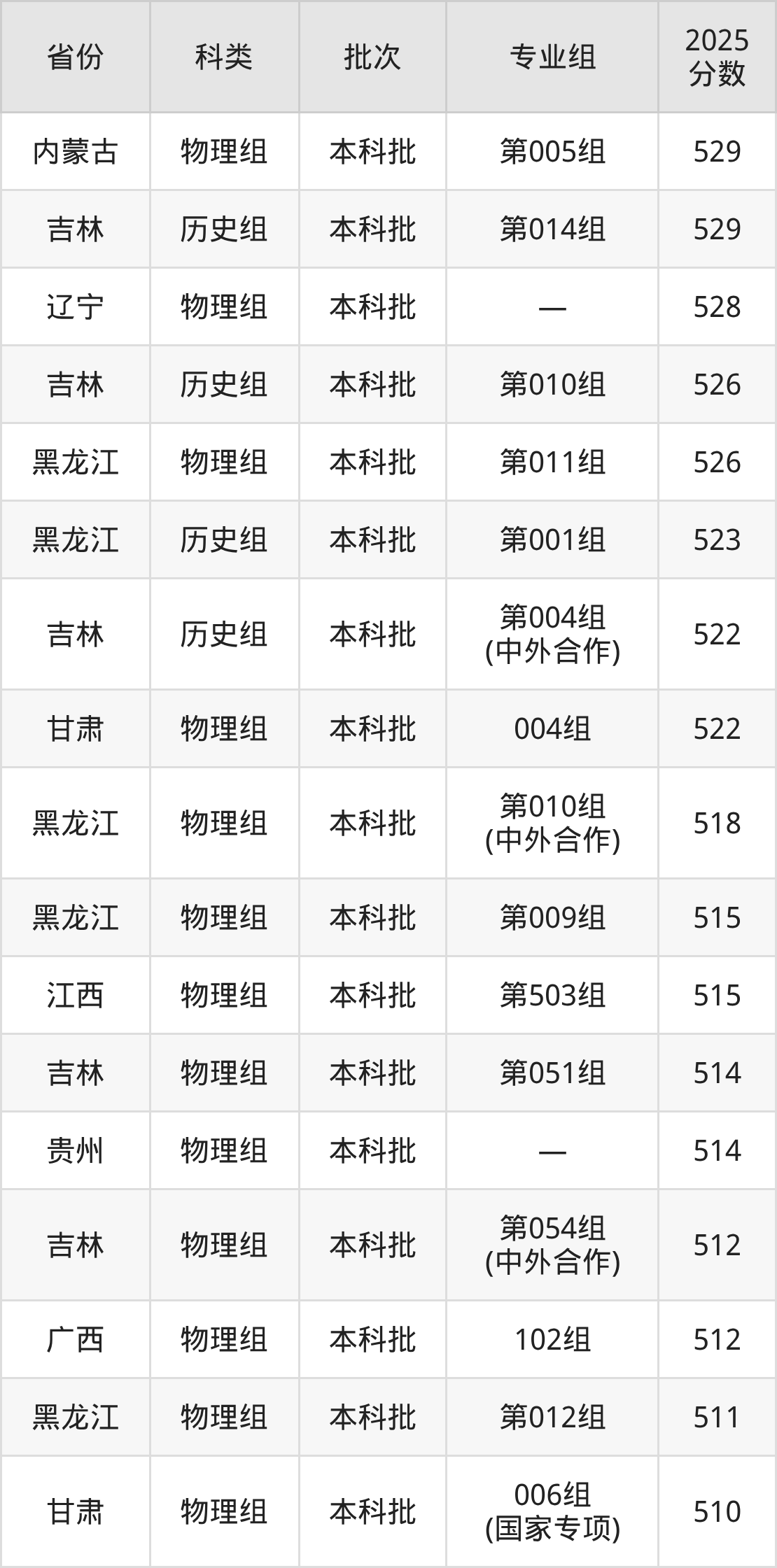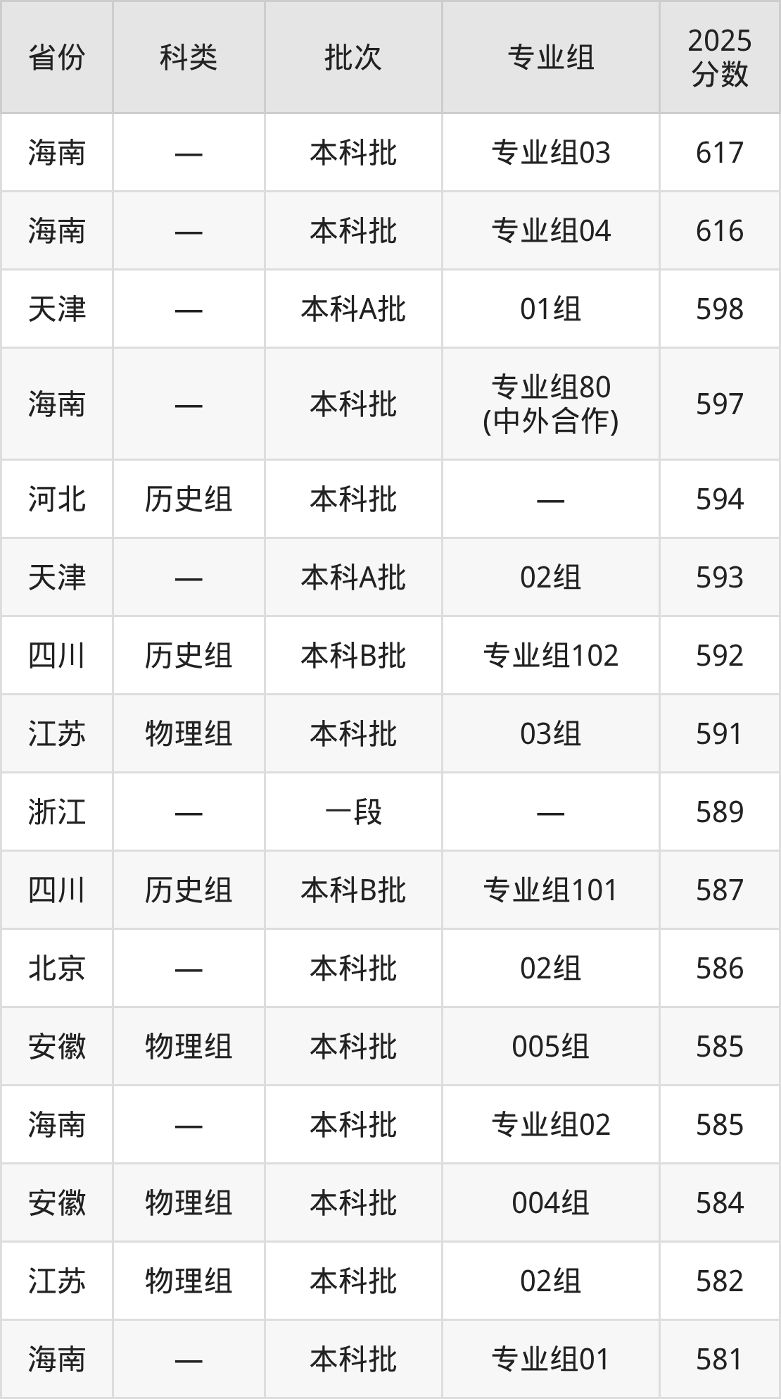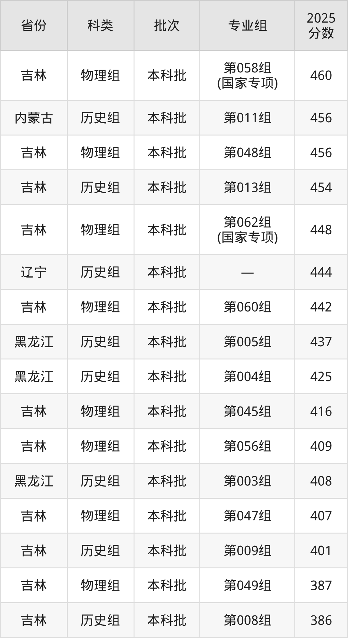 2025年延边大学在全国普通批次招生的录取分数范围位于386~617分之间,其中省内分数范围为386分~554分,历史组最低分专业组为“第008组”,考生386分即可报考,物理组最低分专业组为“第049组”,考生387分即可报考。
