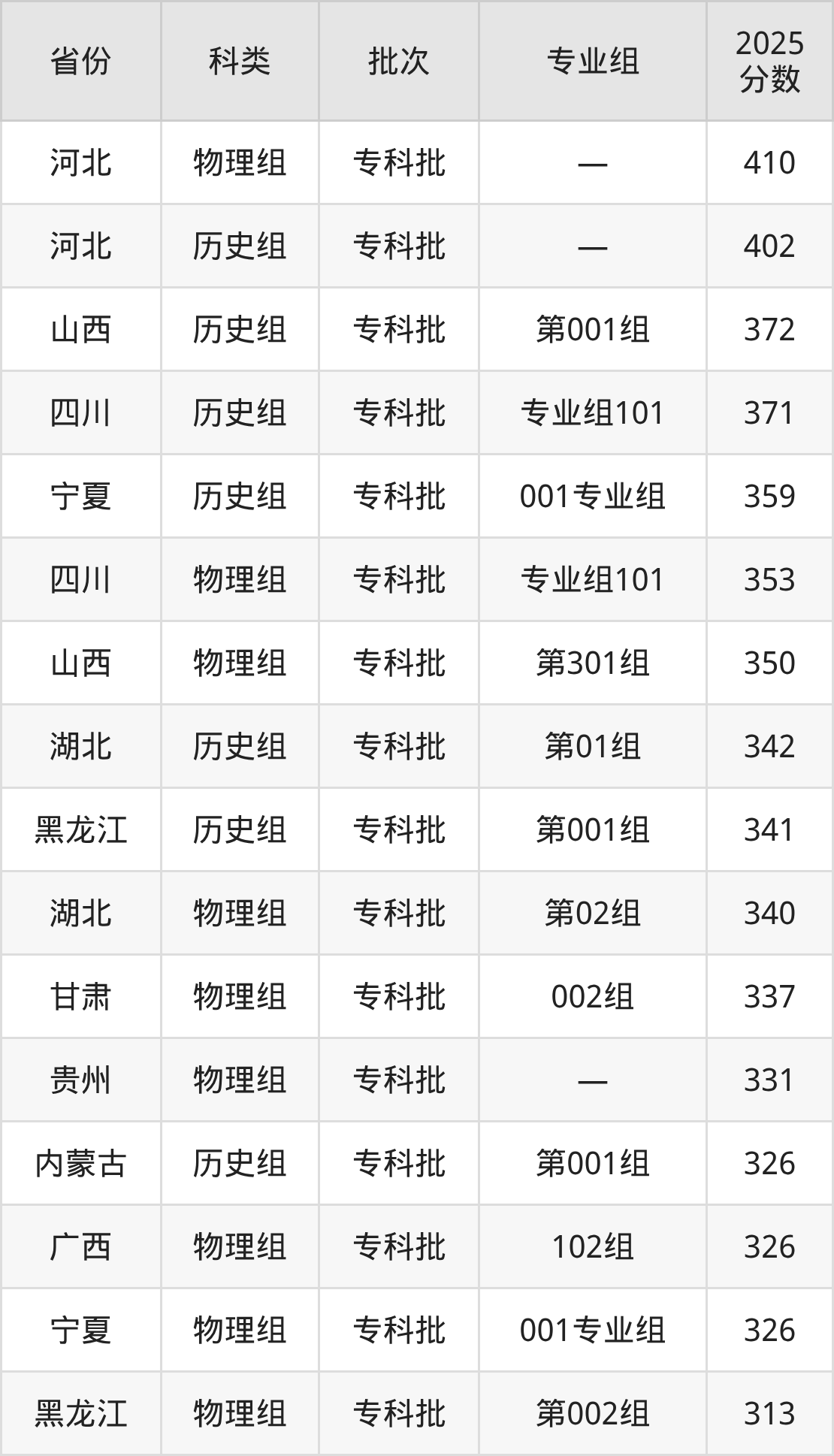 而河北地区物理组考生的分数门槛最高,2025年榆林职业技术学院在河北招生最低分为410分,考生至少要超专科线210分才有可能被录取。