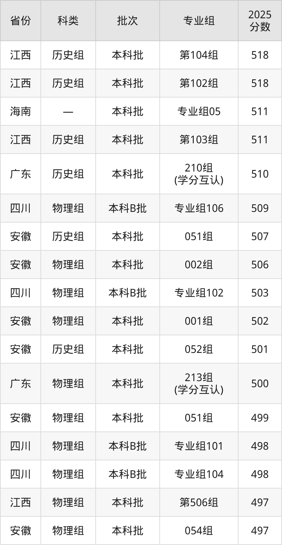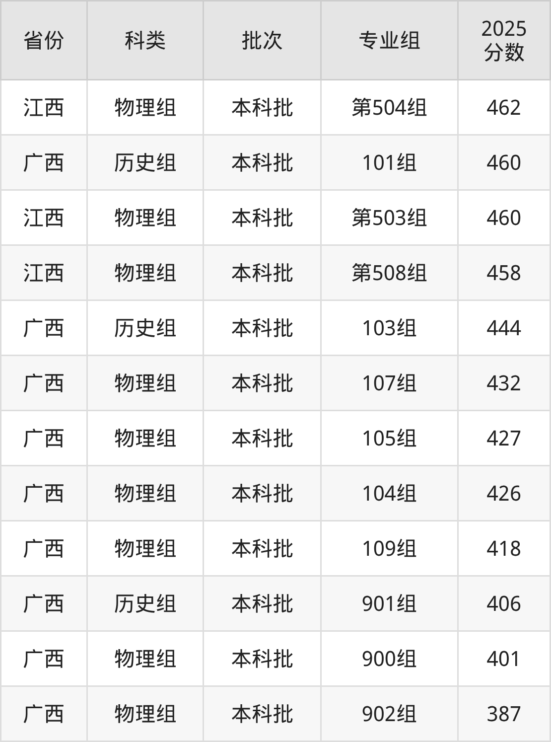 2025年豫章师范学院在全国普通批次招生的录取分数范围位于387~569分之间,其中省内分数范围为458分~532分,历史组最低分专业组为“第103组”,考生511分即可报考,物理组最低分专业组为“第508组”,考生458分即可报考。