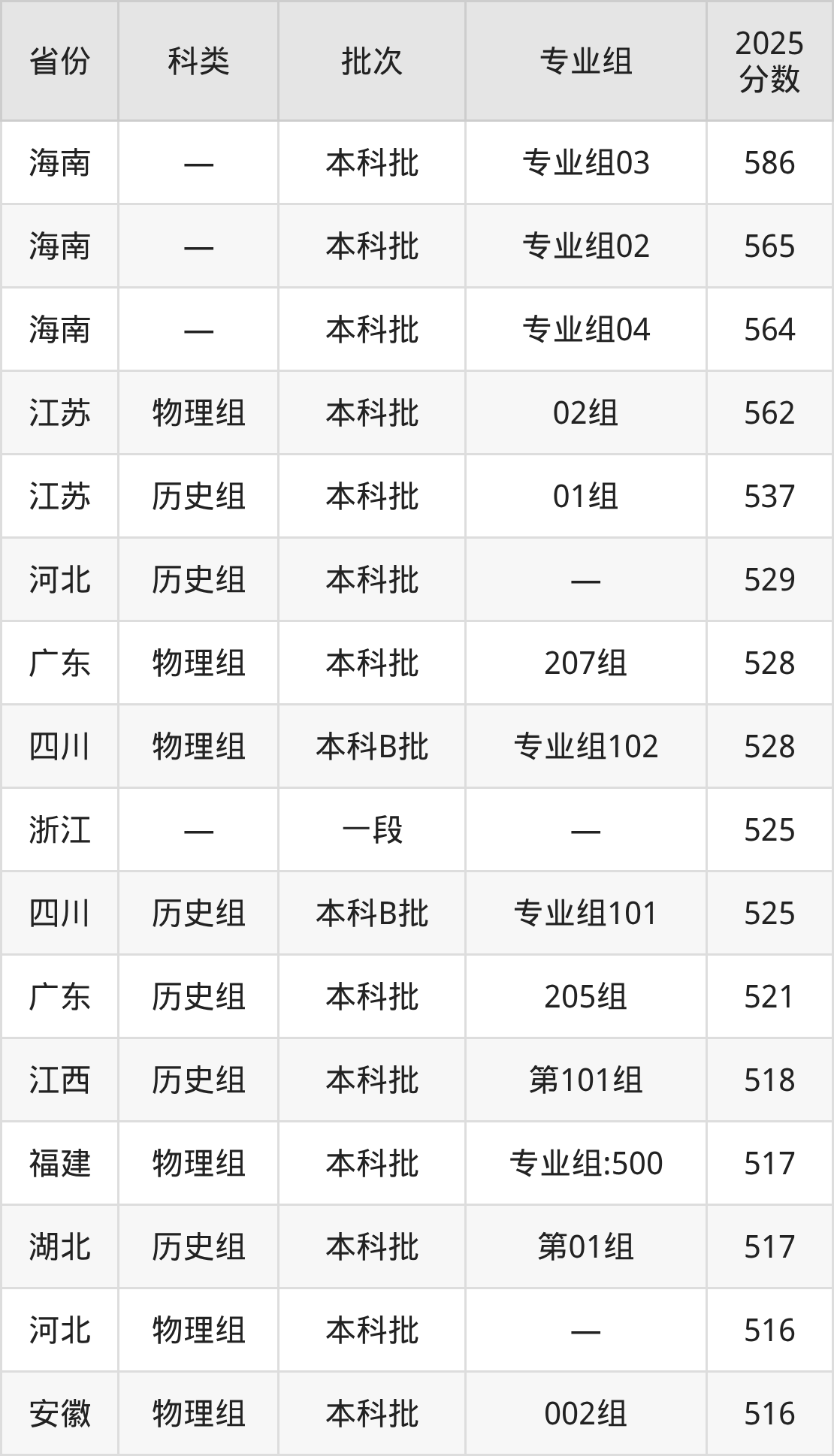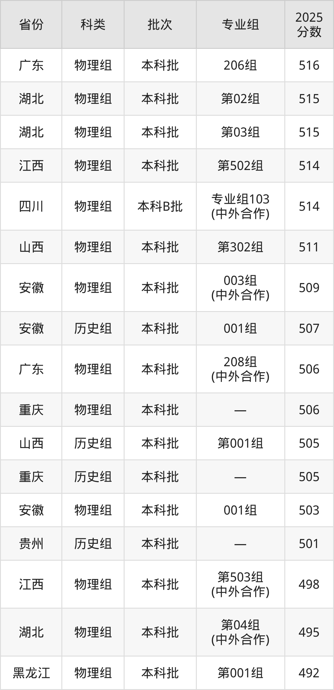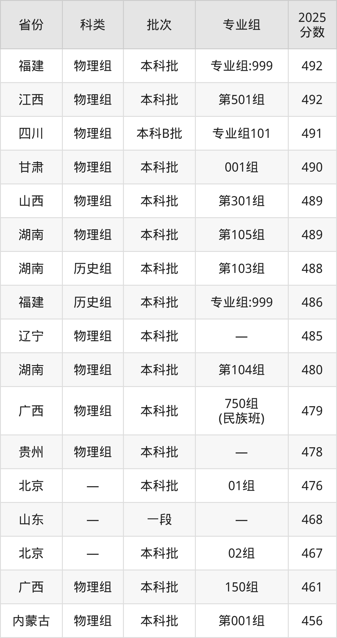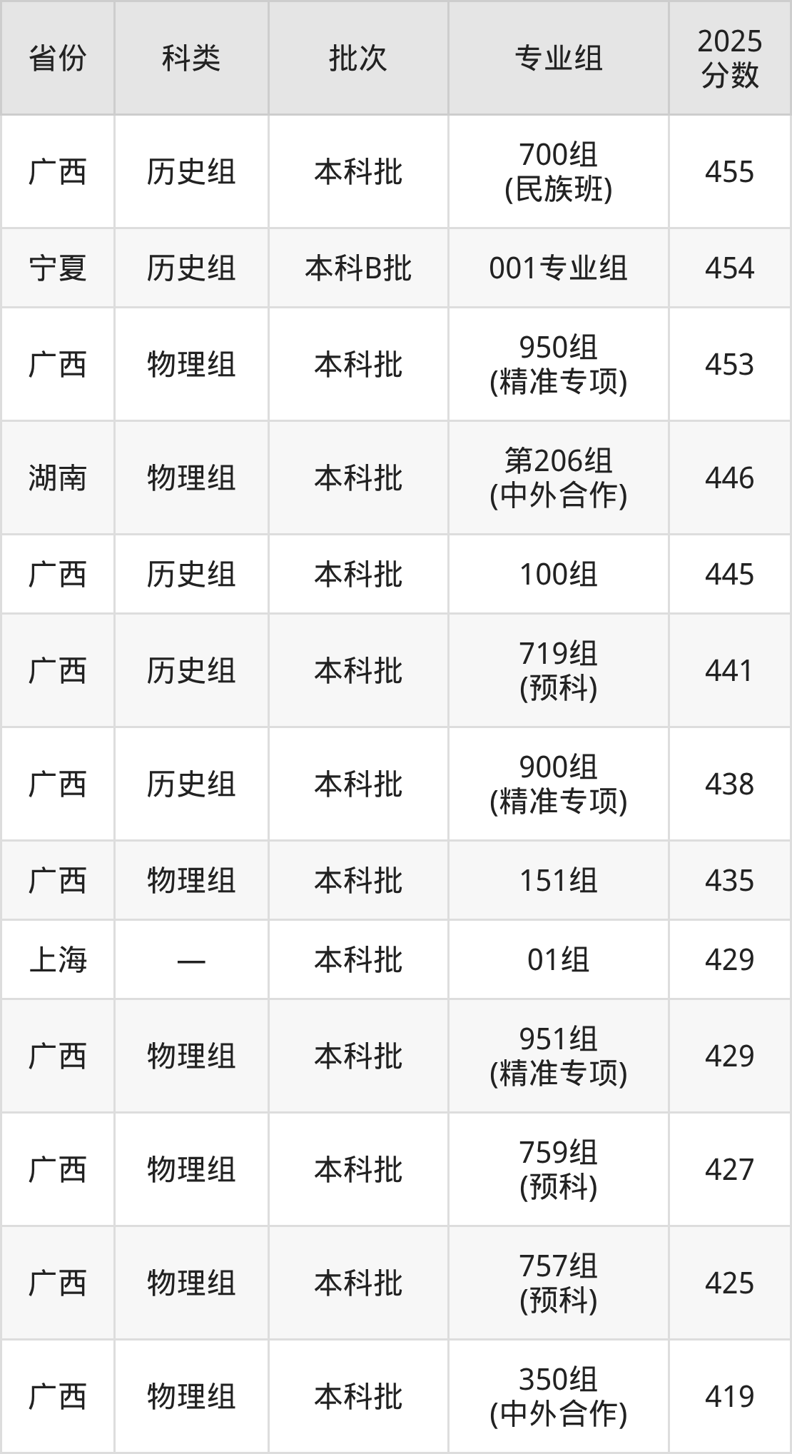 2025年桂林航天工业学院在全国普通批次招生的录取分数范围位于419~586分之间,其中壮族自治区内分数范围为419分~479分,物理组最低分专业组为“350组(中外合作)”,考生419分即可报考,历史组最低分专业组为“900组(精准专项)”,考生438分即可报考。