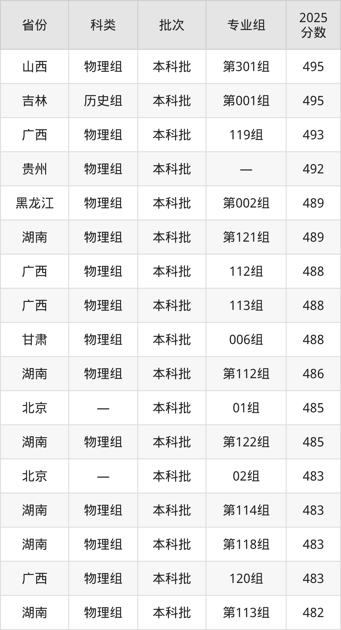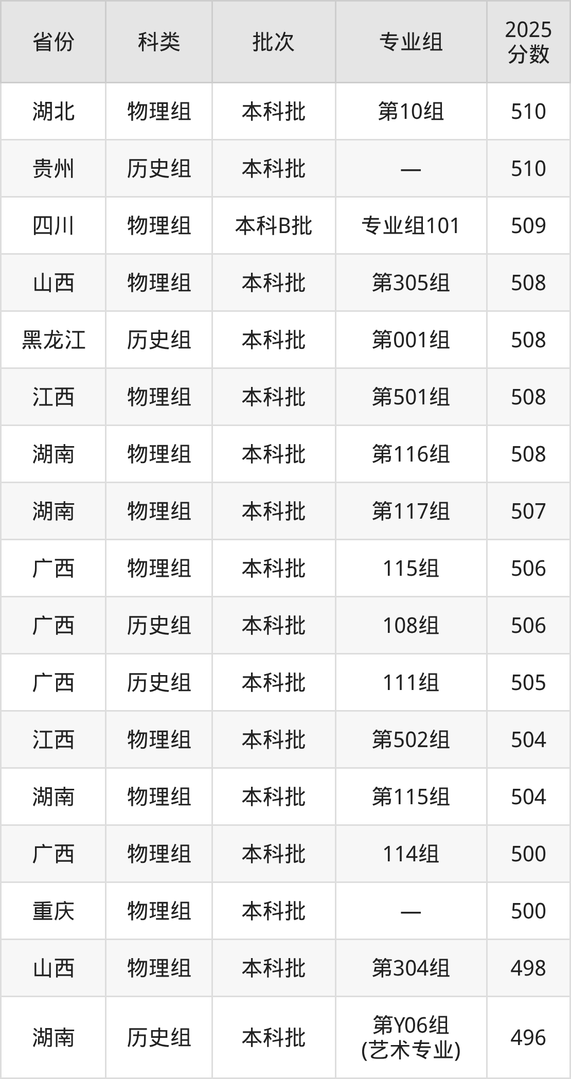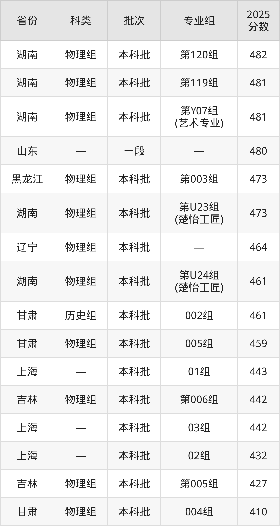 2025年长沙学院在全国普通批次招生的录取分数范围位于410~597分之间,其中省内分数范围为461分~517分,历史组最低分专业组为“第Y06组(艺术专业)”,考生496分即可报考,物理组最低分专业组为“第U24组(楚怡工匠)”,考生461分即可报考。