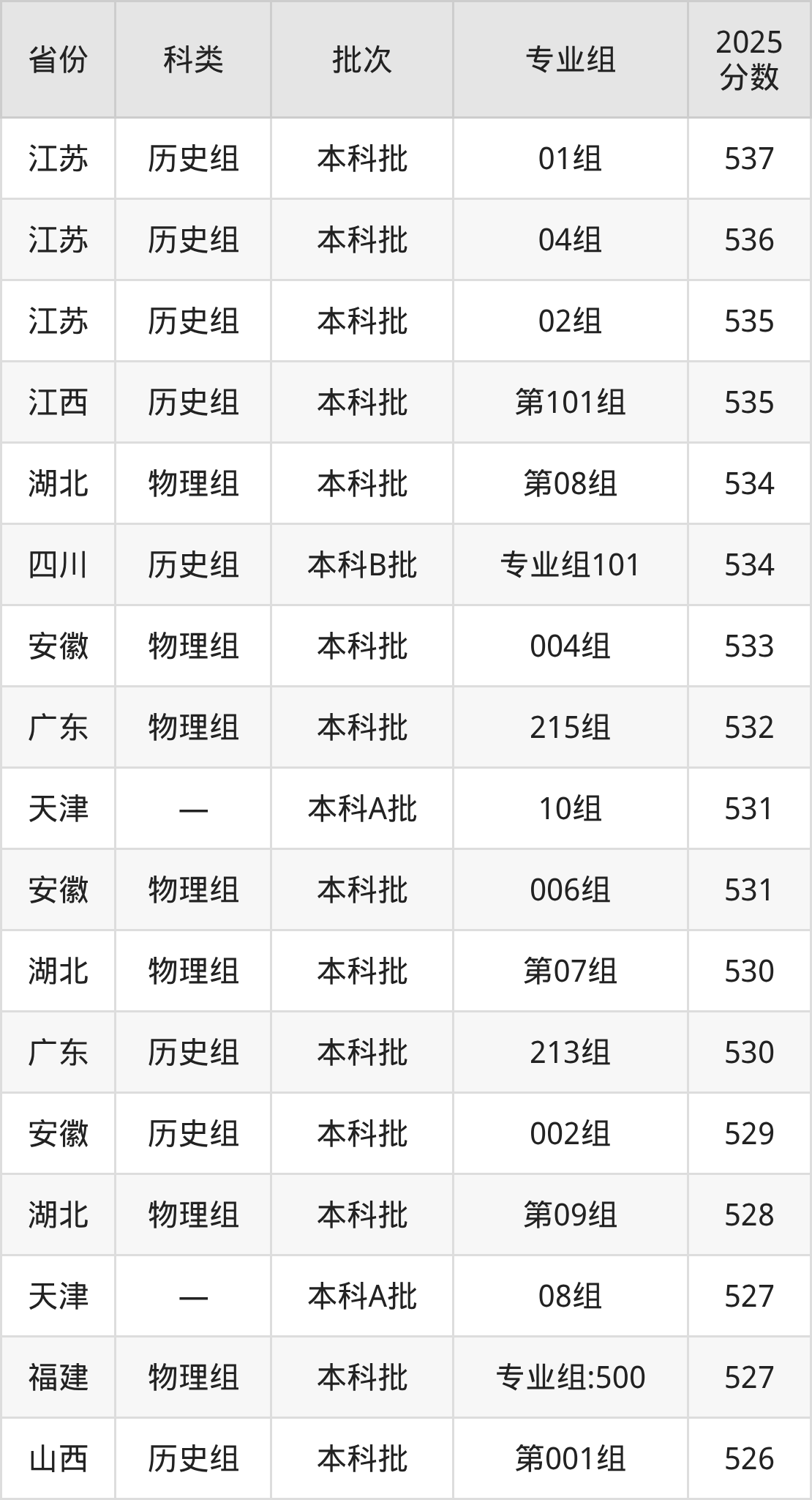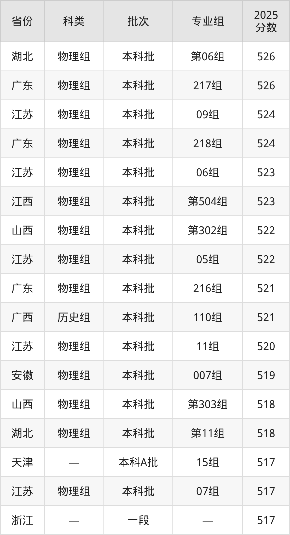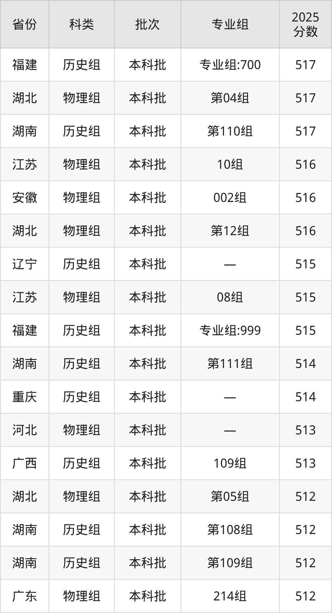 2025年长沙学院在全国普通批次招生的录取分数范围位于410~597分之间,其中省内分数范围为461分~517分,历史组最低分专业组为“第Y06组(艺术专业)”,考生496分即可报考,物理组最低分专业组为“第U24组(楚怡工匠)”,考生461分即可报考。
