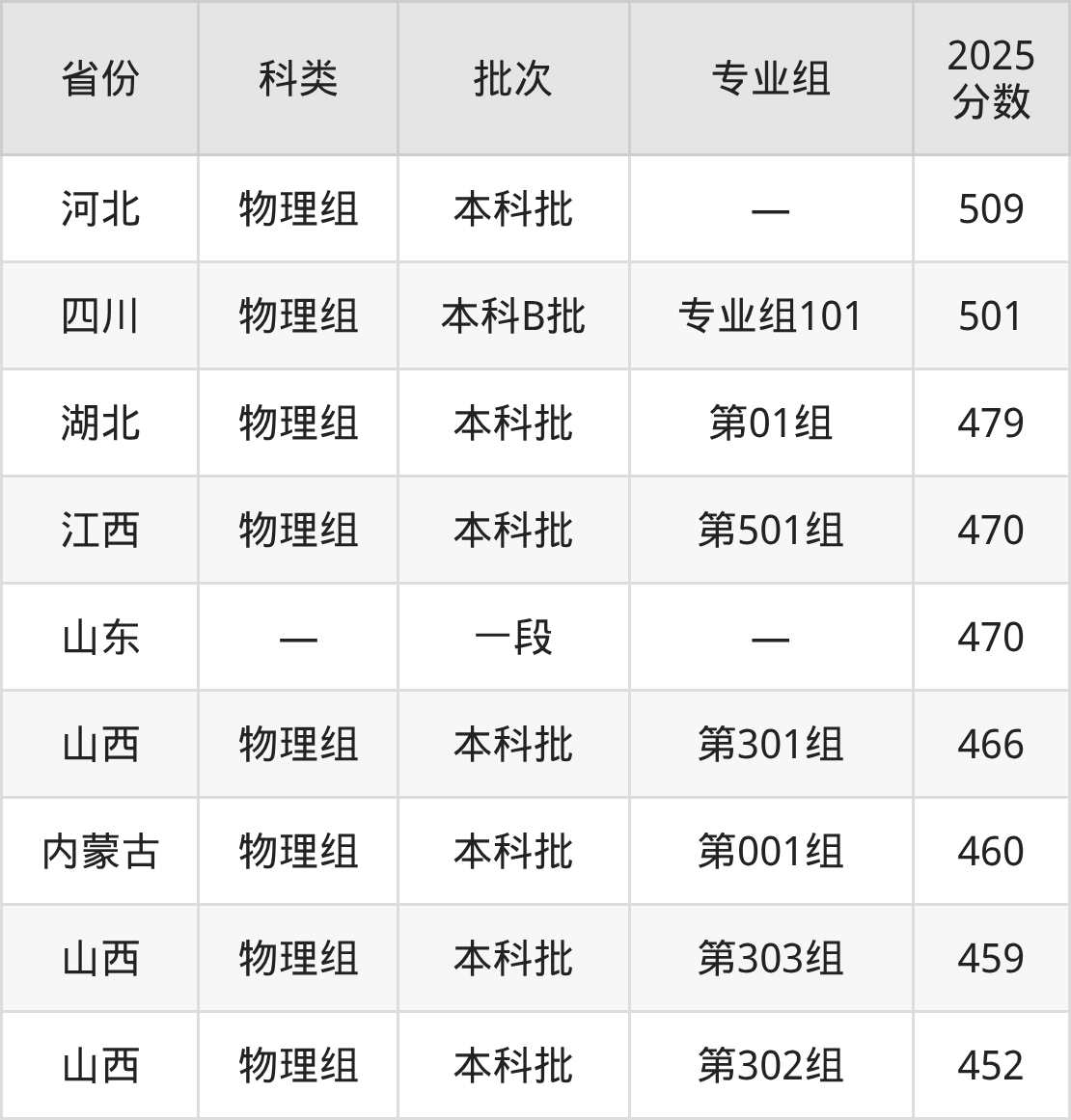 2025年山西能源学院在全国普通批次招生的录取分数范围位于452~509分之间,其中省内分数范围为452分~466分,物理组最低分专业组为“第302组”,考生452分即可报考。