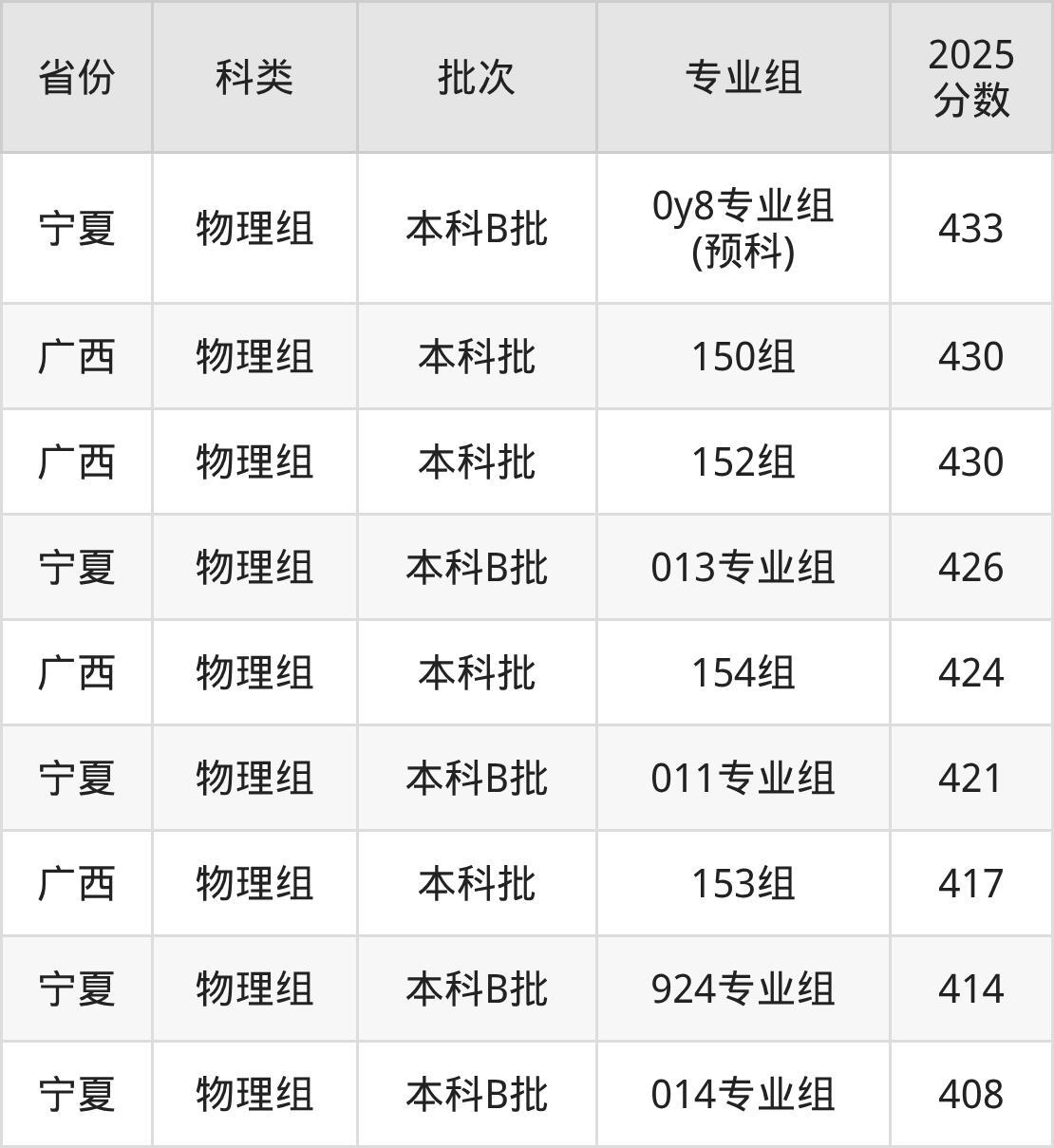 宁夏师范大学在回族自治区外招生的最低分为417分,其中广西地区物理组考生上宁夏师范大学的分数门槛最低,考生成绩超本科线47分(417分)可上。其次是湖南物理组考生,上宁夏师范大学至少要超本科线46分(451分)。