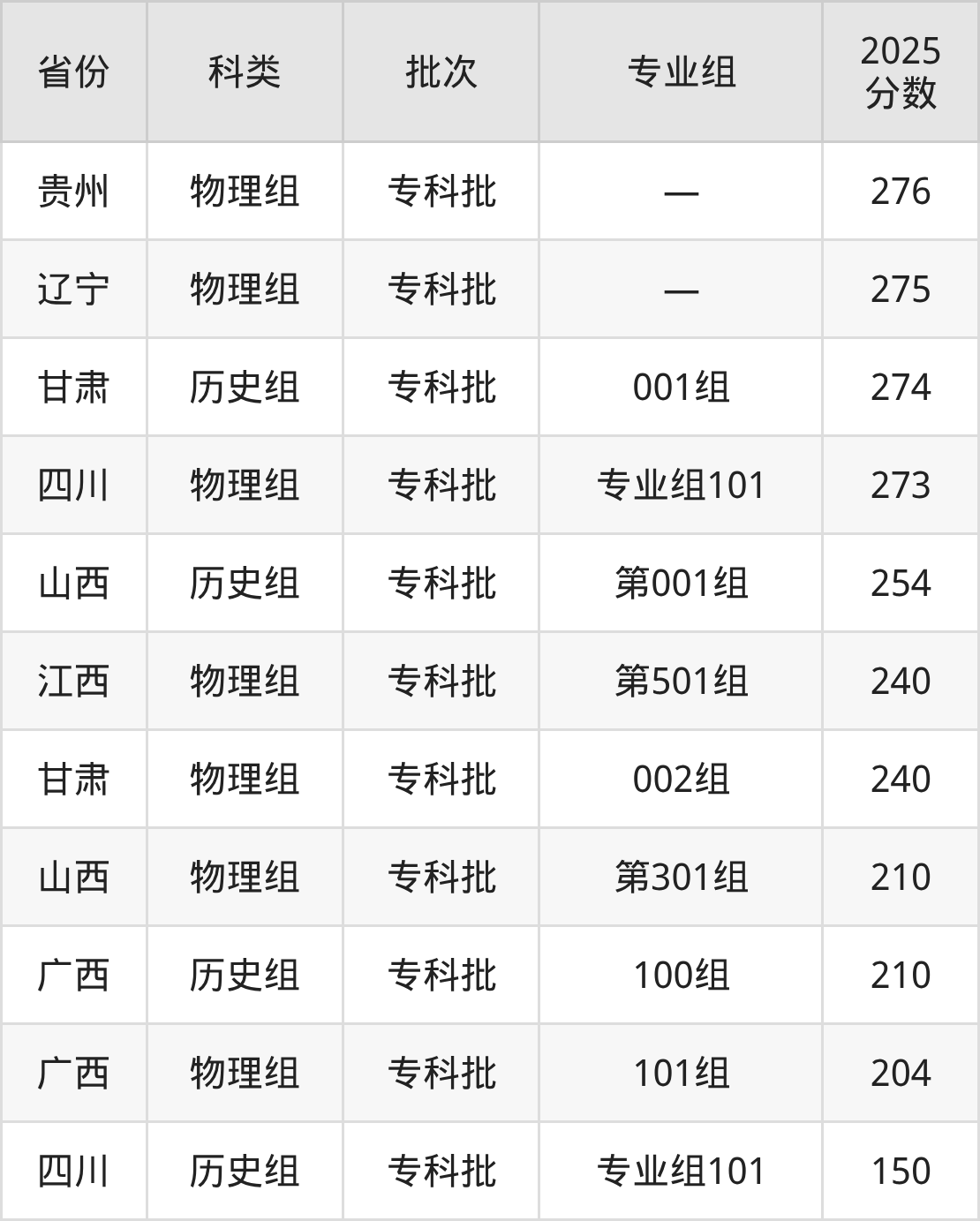 阜新高等专科学校在省外招生的最低分为150分,其中四川地区历史组考生上阜新高等专科学校的分数门槛最低,考生成绩达专科线即可报考。其次是广西物理组考生,上阜新高等专科学校至少要超专科线4分(204分)。