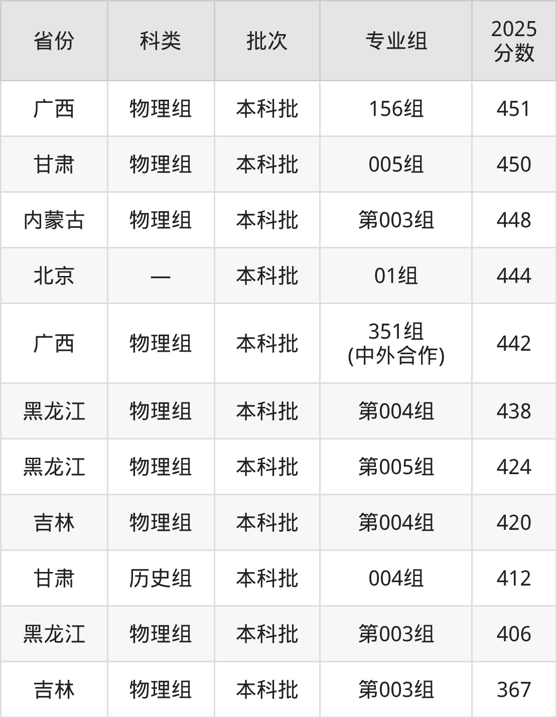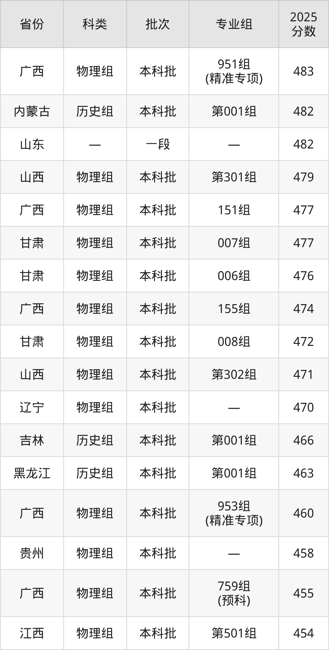 2025年南宁师范大学在全国普通批次招生的录取分数范围位于367~638分之间,其中壮族自治区内分数范围为442分~545分,历史组最低分专业组为“719组(预科)”,考生486分即可报考,物理组最低分专业组为“351组(中外合作)”,考生442分即可报考。