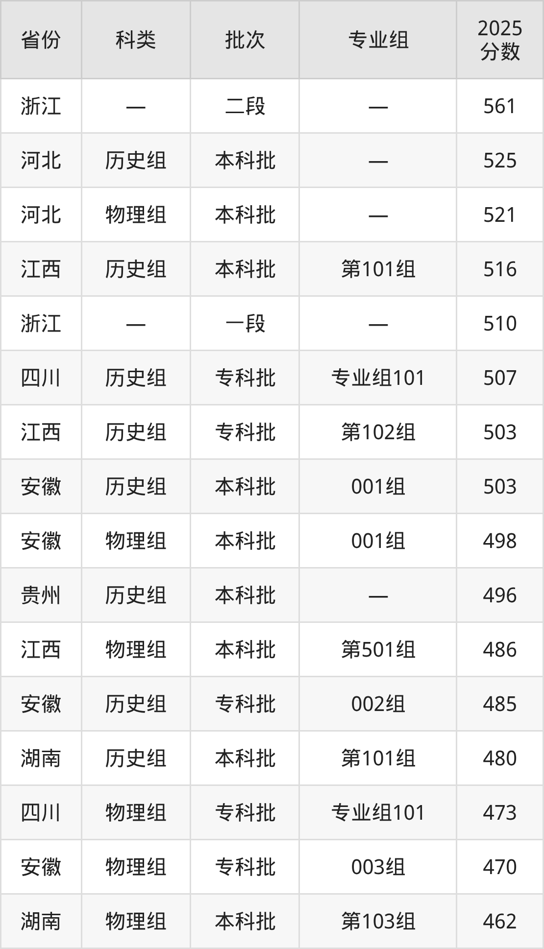 下面是金华职业技术大学2025年在全国各省的录取分数线一览表,供参考: