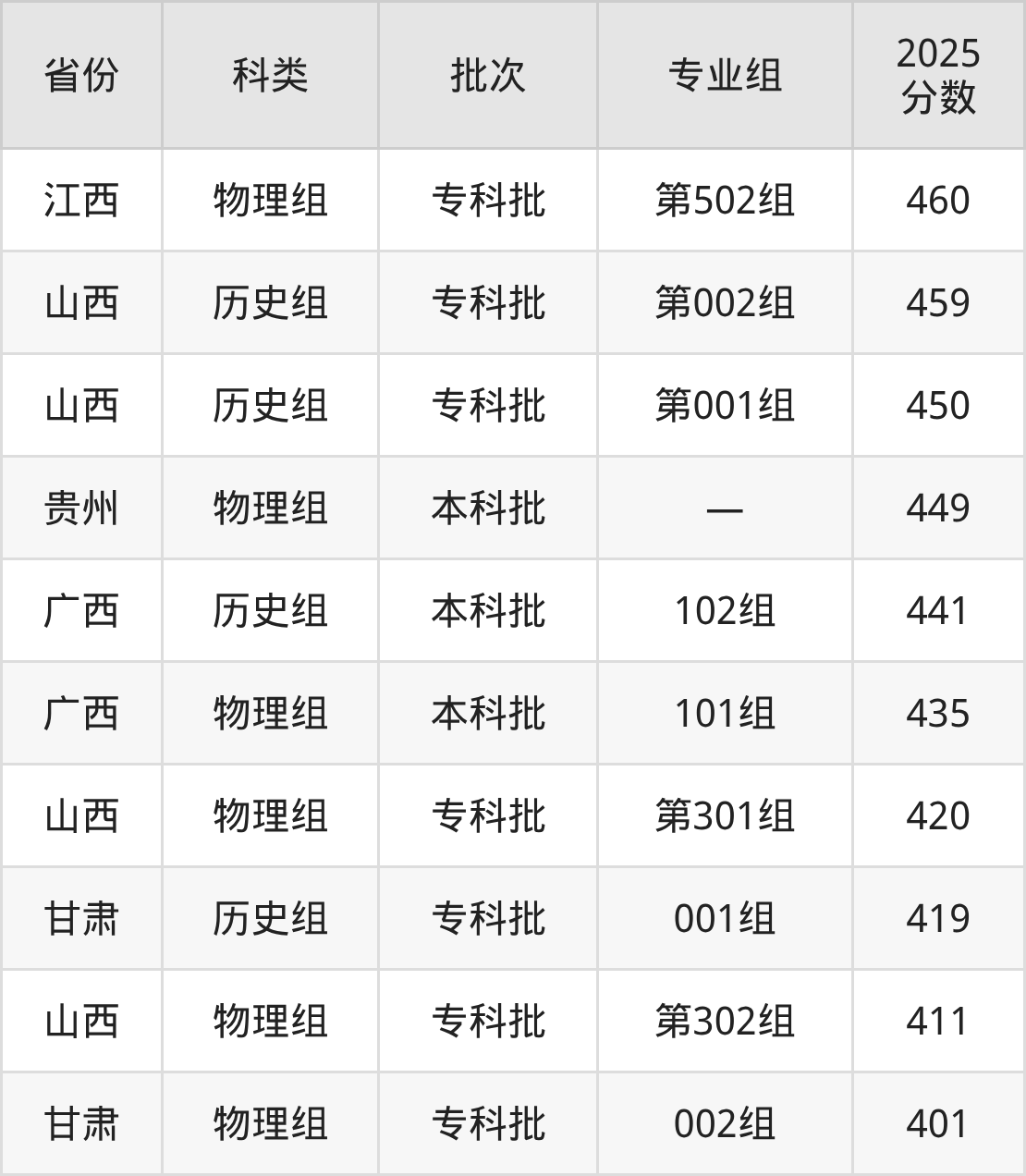 金华职业技术大学在省内招生最低录取分数线为510分,在省外招生最低录取分数线为401分,不同地区、不同科类的考生最低分有差异。