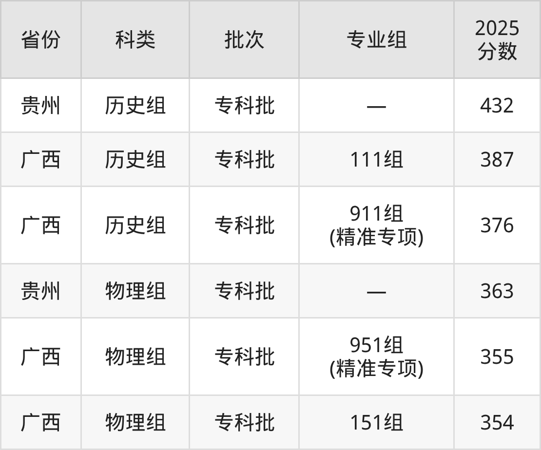 2025年广西工商职业技术学院在全国普通批次招生的录取分数范围位于354~432分之间,其中壮族自治区内分数范围为354分~387分,历史组最低分专业组为“911组(精准专项)”,考生376分即可报考,物理组最低分专业组为“151组”,考生354分即可报考。