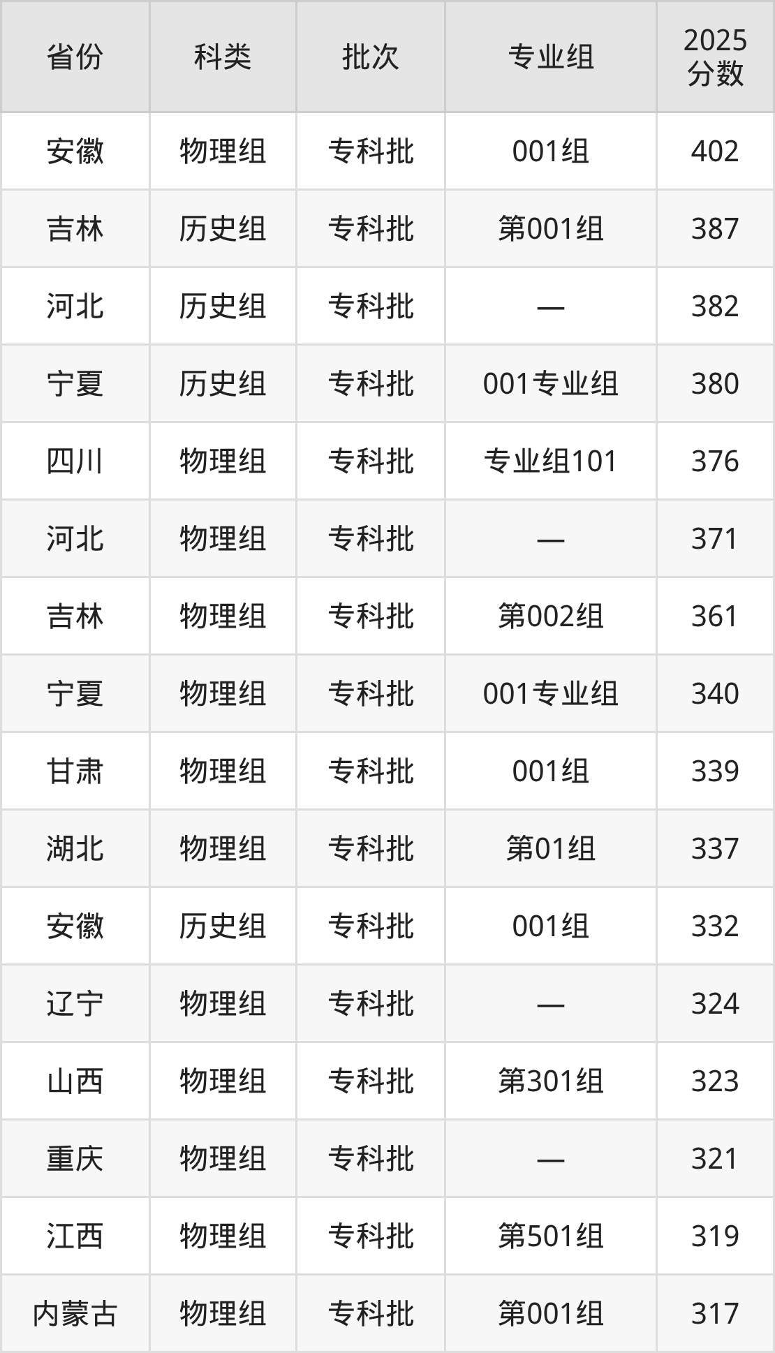 而安徽地区物理组考生的分数门槛最高,2025年山东铝业职业学院001组在安徽招生最低分为402分,考生至少要超专科线202分才有可能被录取。