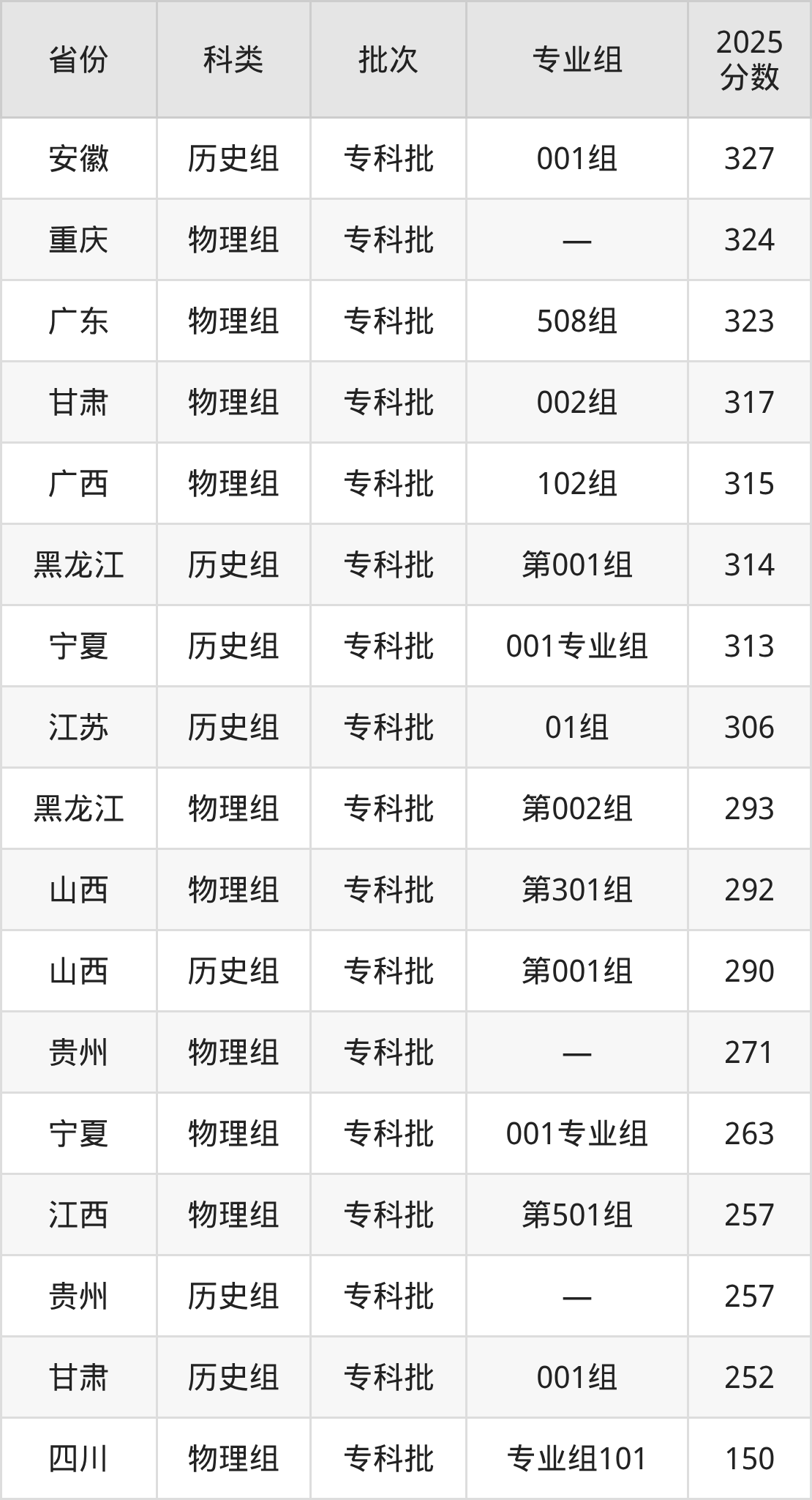 随州职业技术学院在省外招生的最低分为150分,其中四川地区物理组考生上随州职业技术学院的分数门槛最低,考生成绩达专科线即可报考。其次是甘肃历史组考生,上随州职业技术学院至少要超专科线92分(252分)。