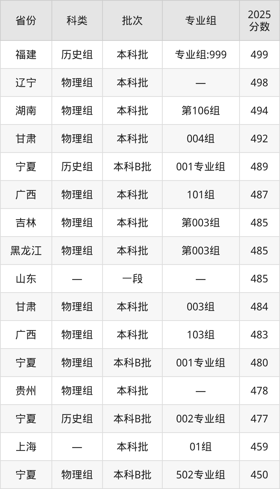 山东理工大学在省内招生最低录取分数线为485分,在省外招生最低录取分数线为450分,不同地区、不同科类的考生最低分有差异。