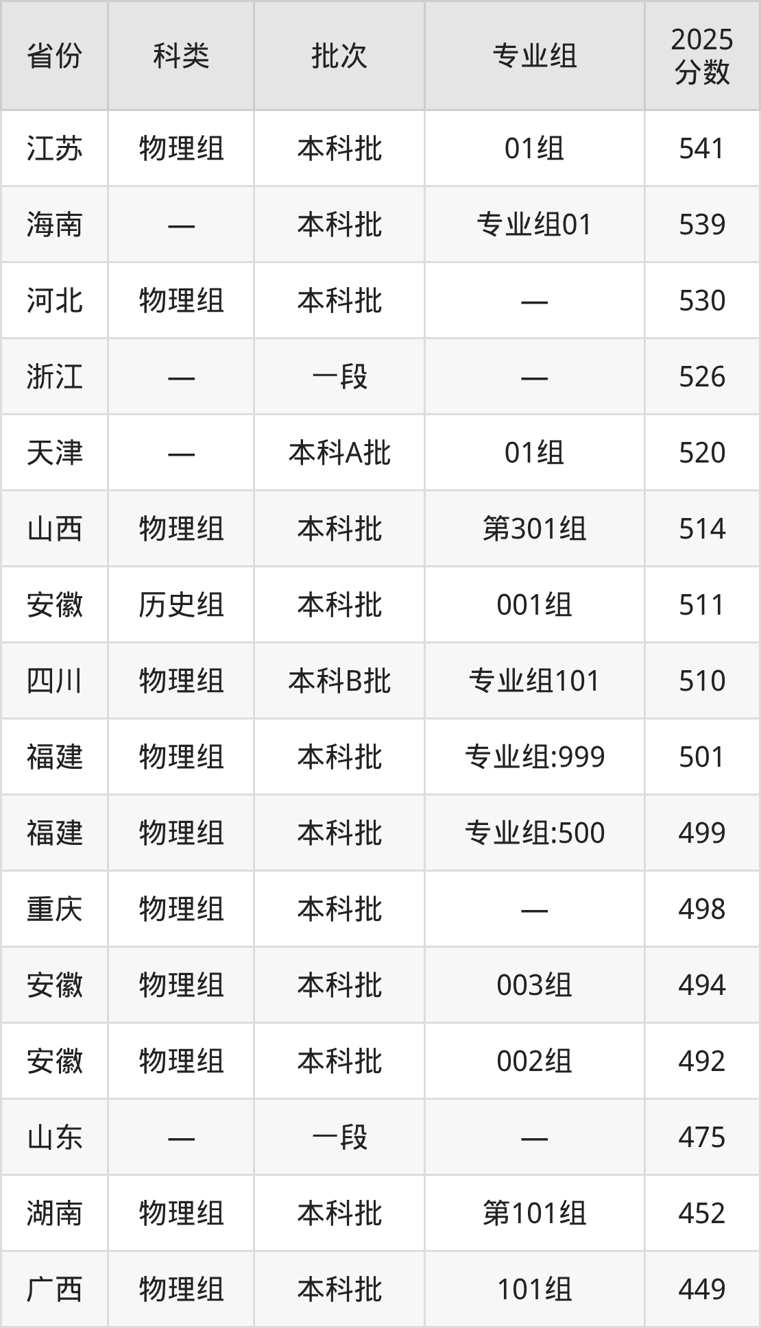 而江苏地区物理组考生的分数门槛最高,2025年蚌埠学院01组在江苏招生最低分为541分,考生至少要超本科线78分才有可能被录取。