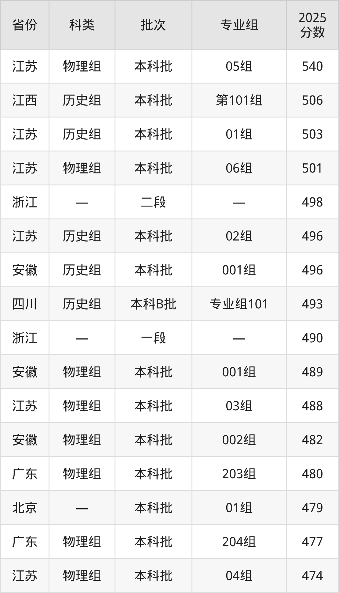 2025年南通大学杏林学院在全国普通批次招生的录取分数范围位于370~540分之间,其中省内分数范围为474分~540分,物理组最低分专业组为“04组”,考生474分即可报考,历史组最低分专业组为“02组”,考生496分即可报考。