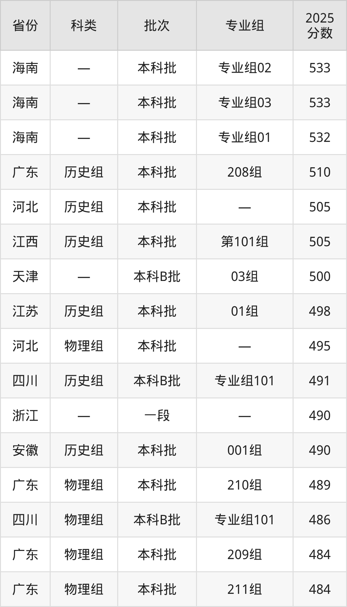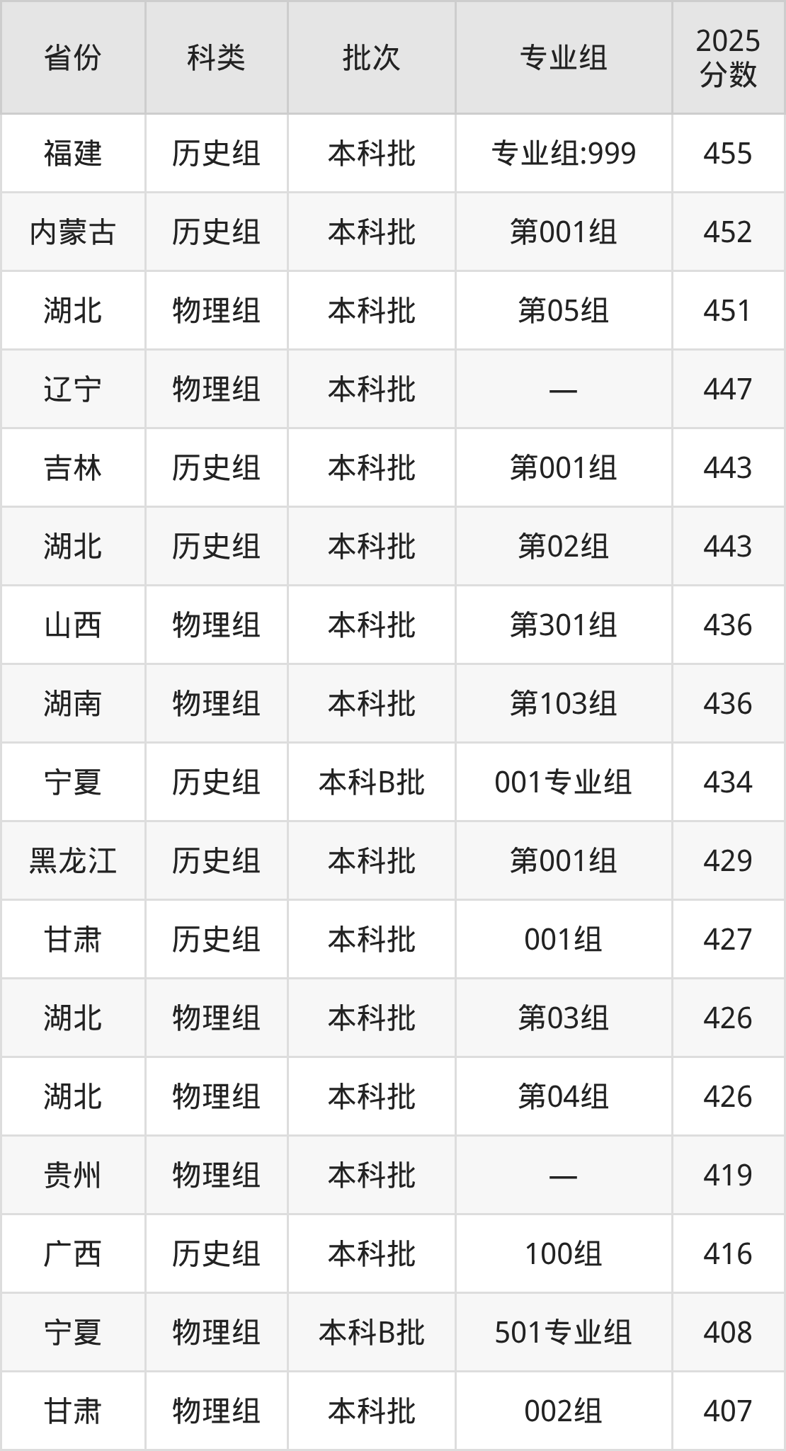 而海南地区考生的分数门槛最高,2025年武汉生物工程学院专业组02在海南招生最低分为533分,考生至少要超本科线53分才有可能被录取。