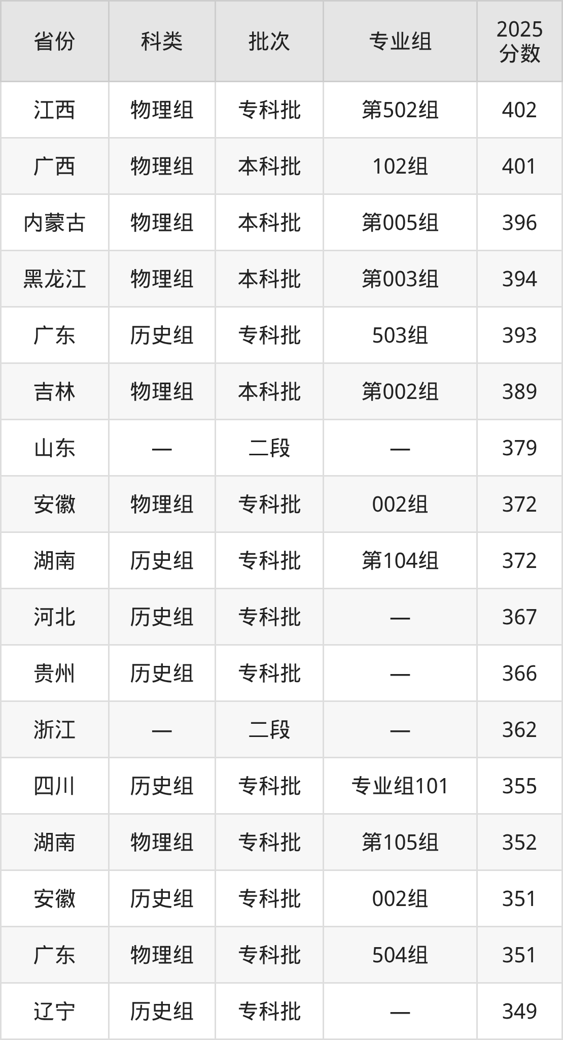 下面是武汉生物工程学院2025年在全国各省的录取分数线一览表,供参考: