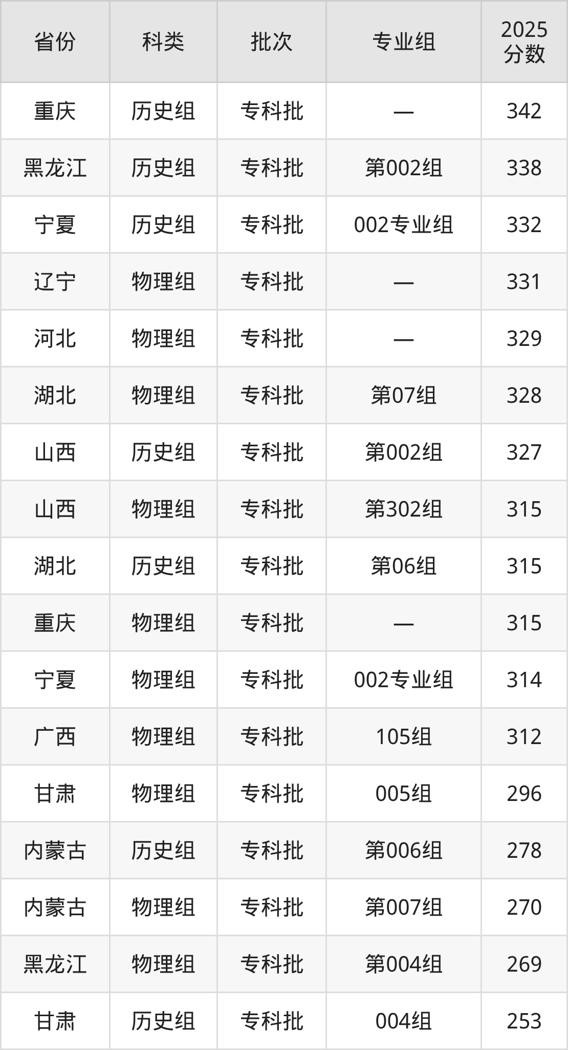 2025年武汉生物工程学院在全国普通批次招生的录取分数范围位于150~533分之间,其中省内分数范围为315分~473分,历史组最低分专业组为“第06组”,考生315分即可报考,物理组最低分专业组为“第07组”,考生328分即可报考。