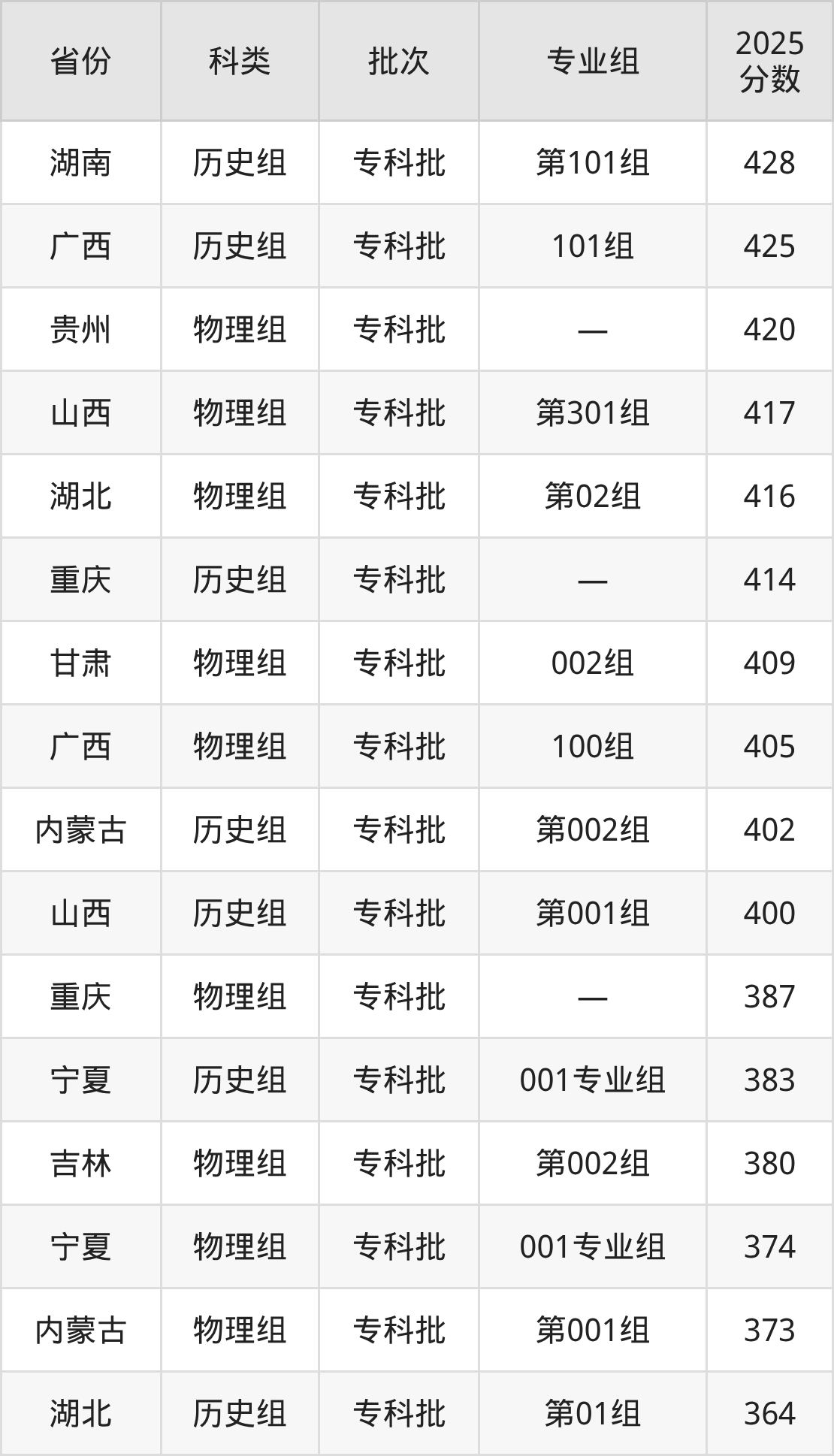 开封大学在省外招生的最低分为364分,其中湖北地区历史组考生上开封大学的分数门槛最低,考生成绩超专科线164分(364分)可上。其次是内蒙古物理组考生,上开封大学至少要超专科线213分(373分)。