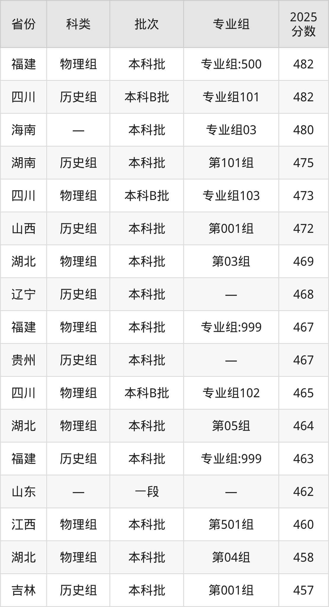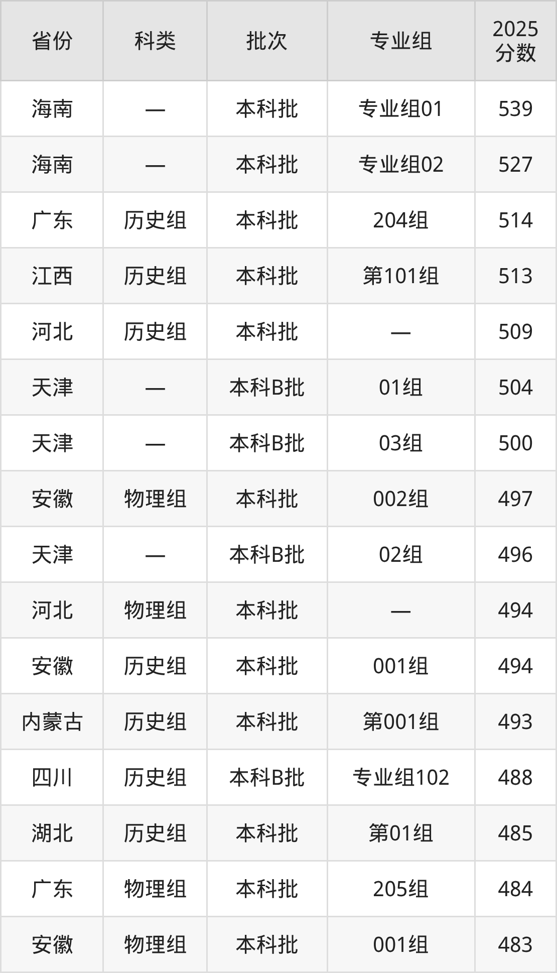 2025年武汉学院在全国普通批次招生的录取分数范围位于375~539分之间,其中省内分数范围为436分~485分,历史组最低分专业组为“第01组”,考生485分即可报考,物理组最低分专业组为“第02组”,考生436分即可报考。