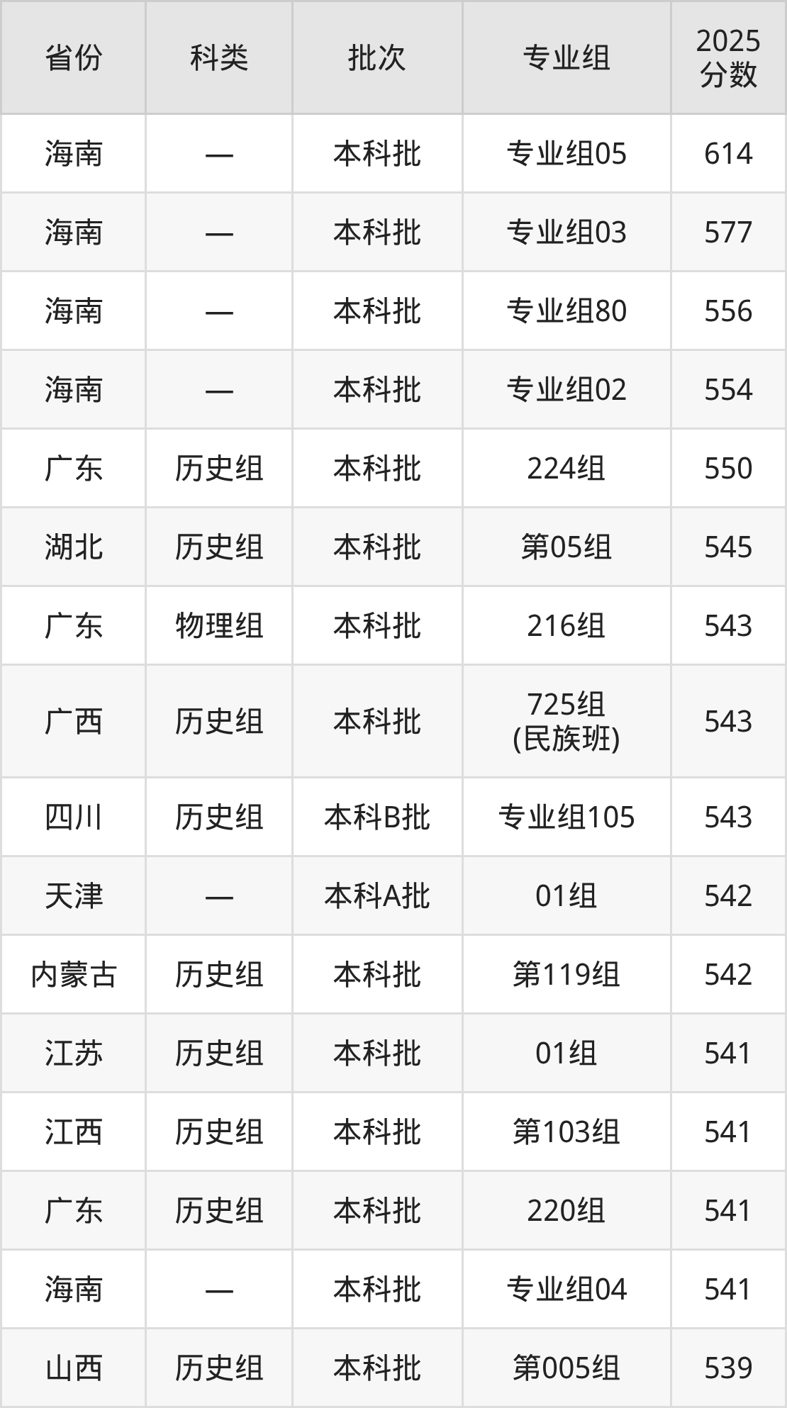 而海南地区考生的分数门槛最高,2025年广西民族大学专业组05在海南招生最低分为614分,考生至少要超本科线134分才有可能被录取。