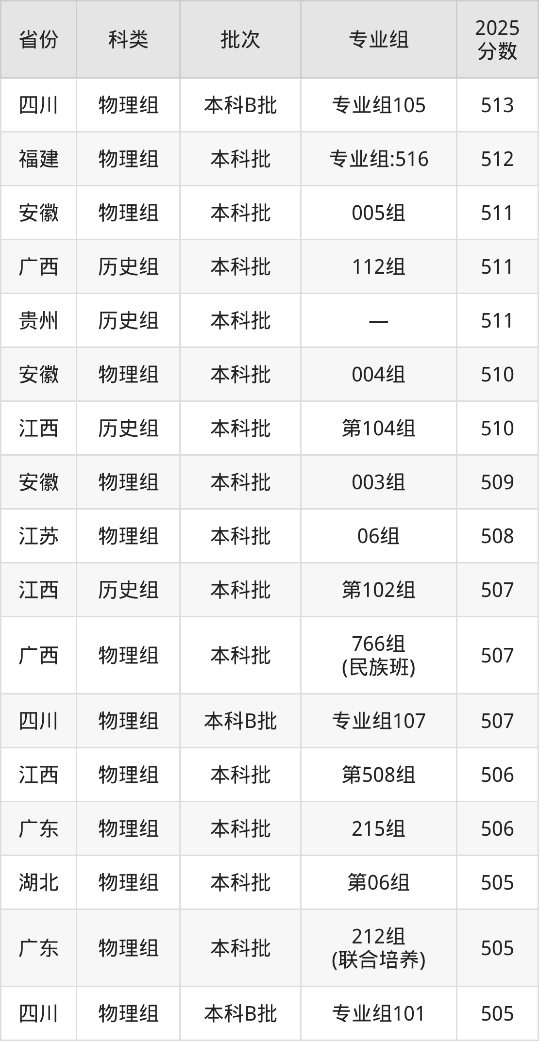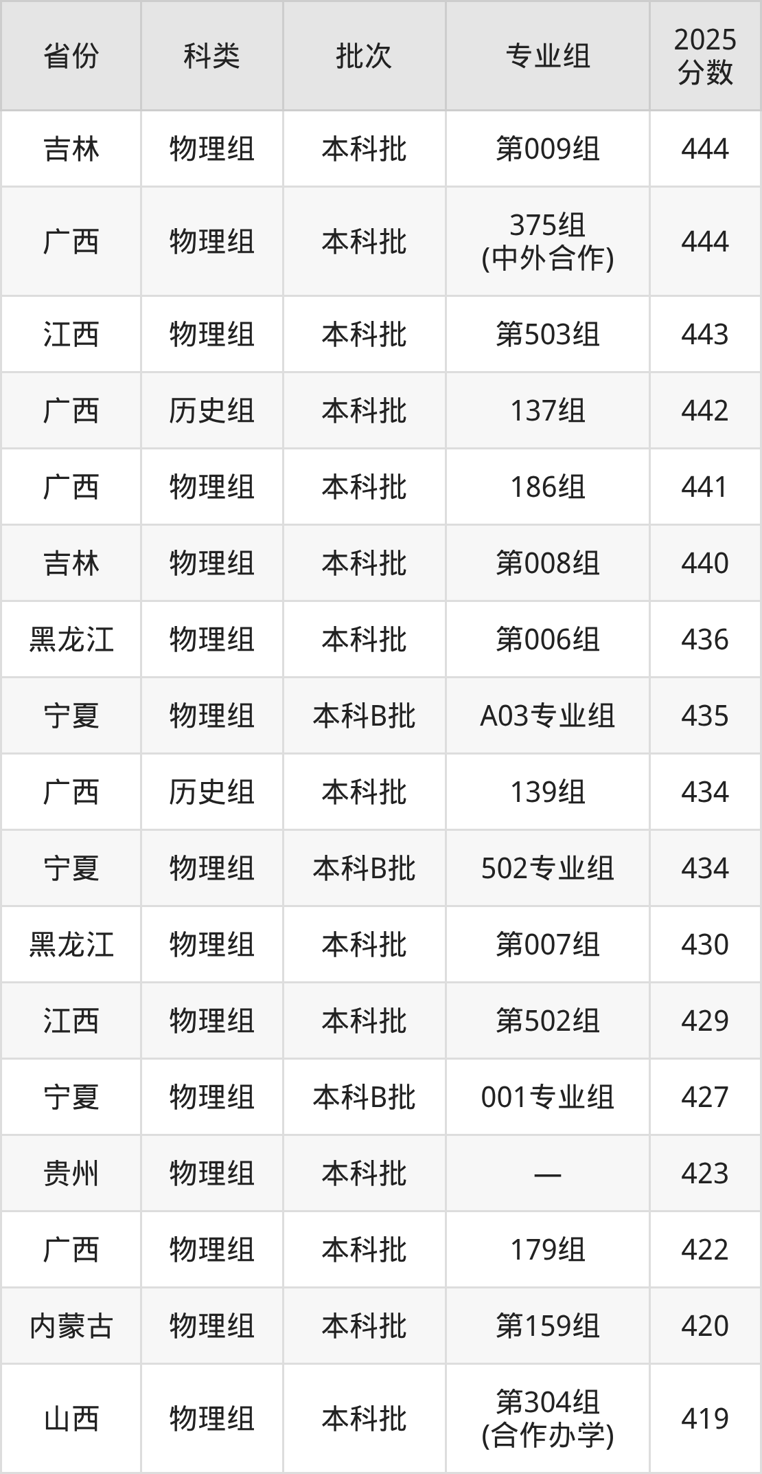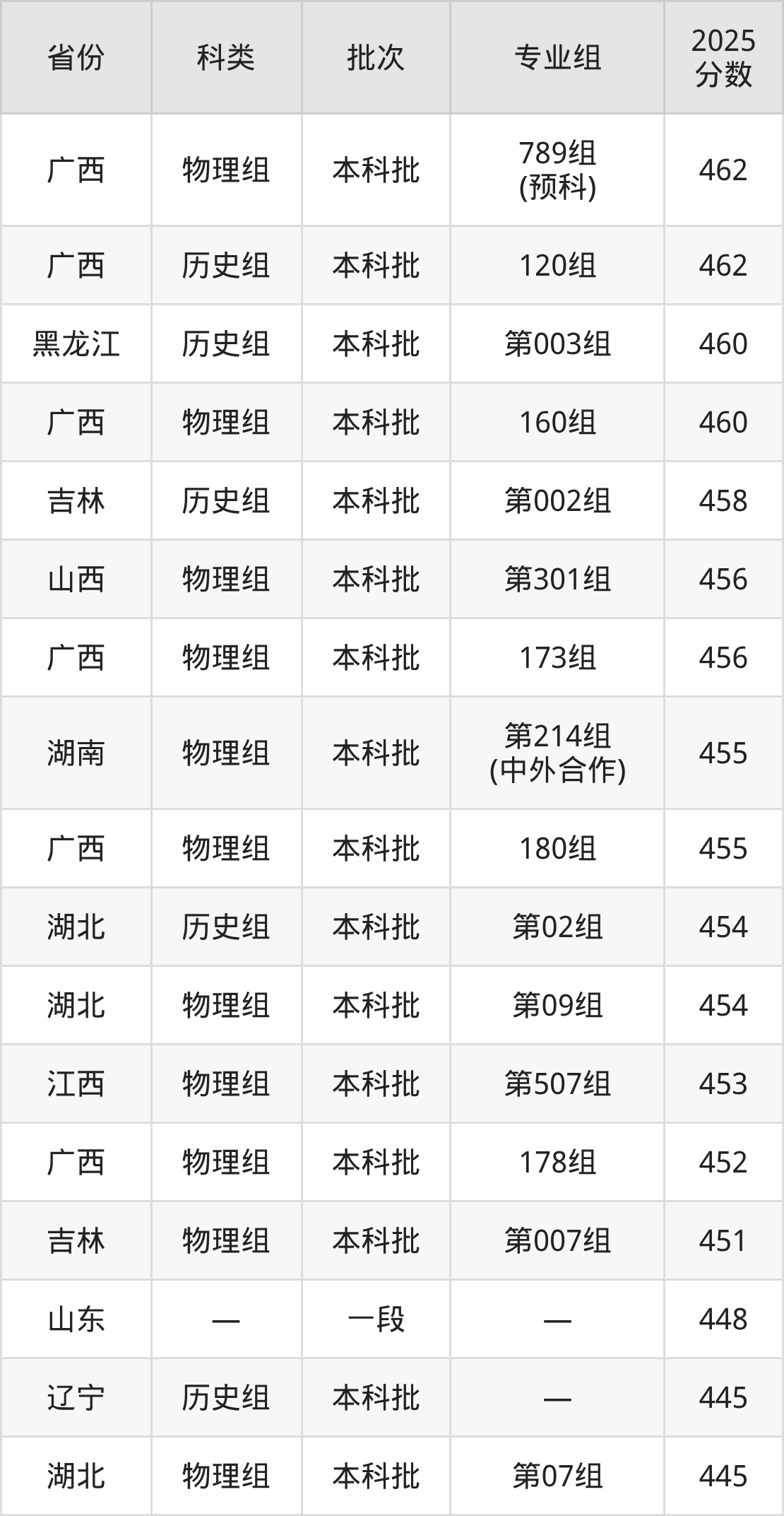 2025年广西民族大学在全国普通批次招生的录取分数范围位于392~614分之间,其中壮族自治区内分数范围为392分~543分,历史组最低分专业组为“139组”,考生434分即可报考,物理组最低分专业组为“177组”,考生392分即可报考。
