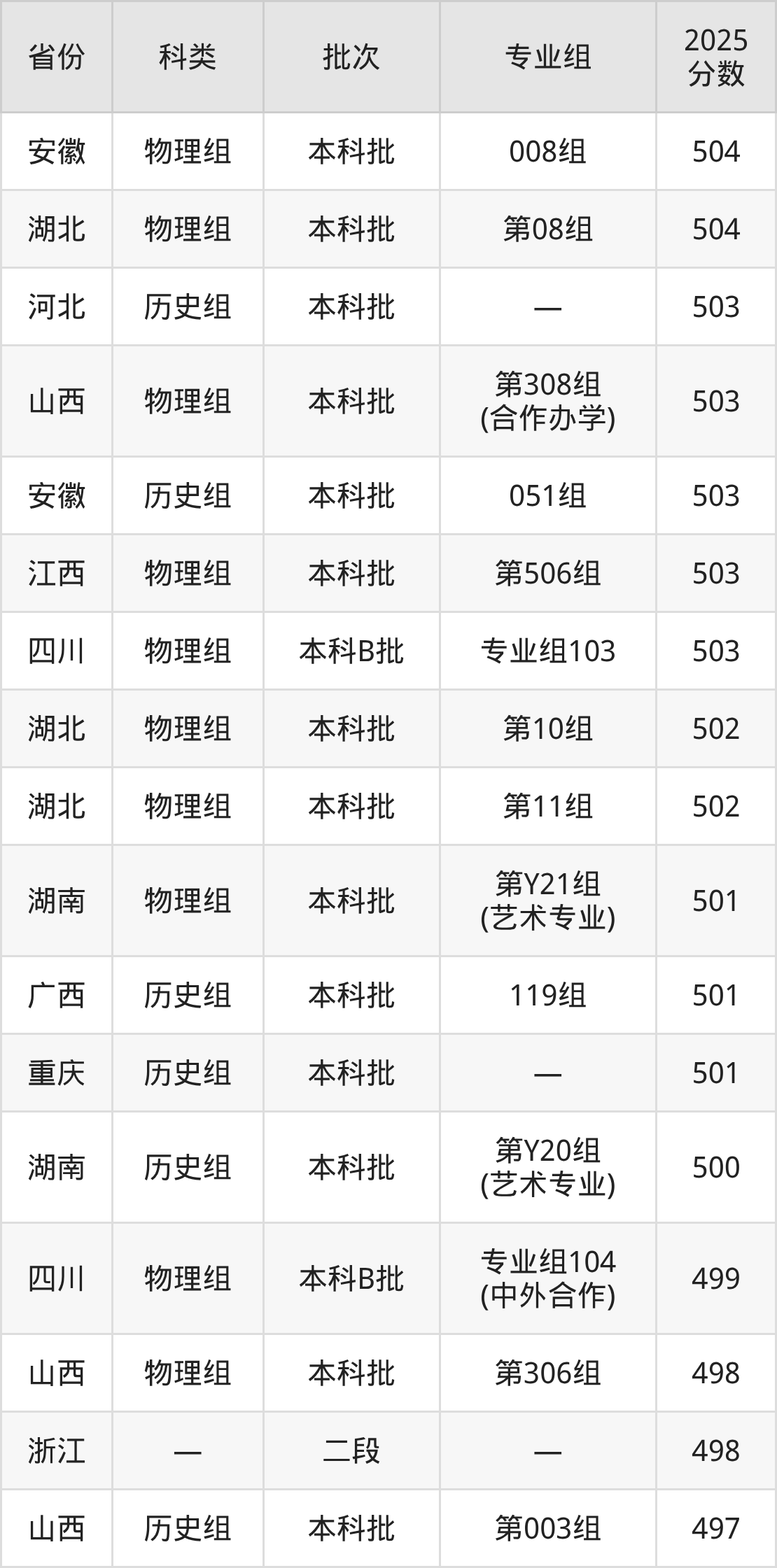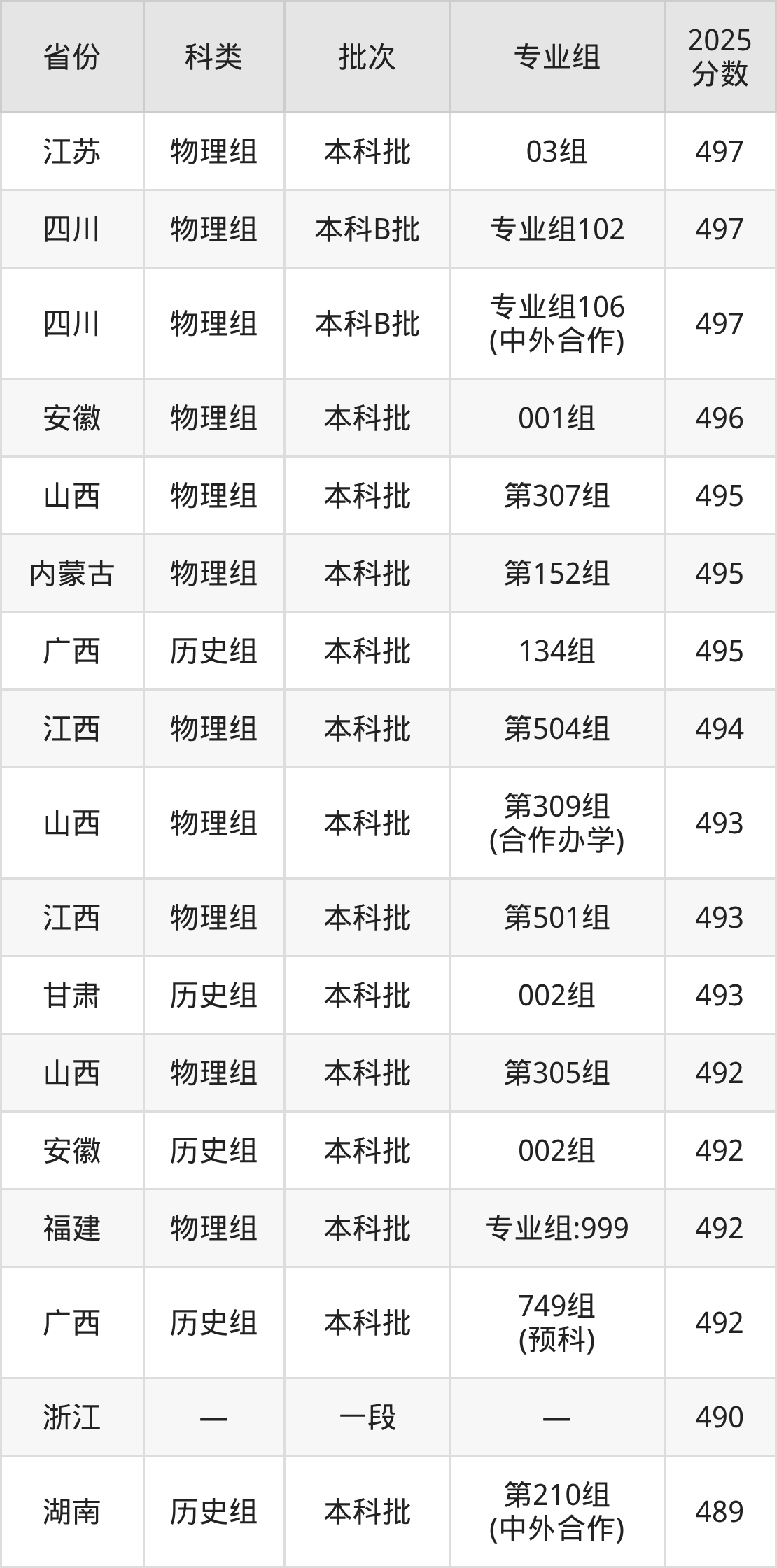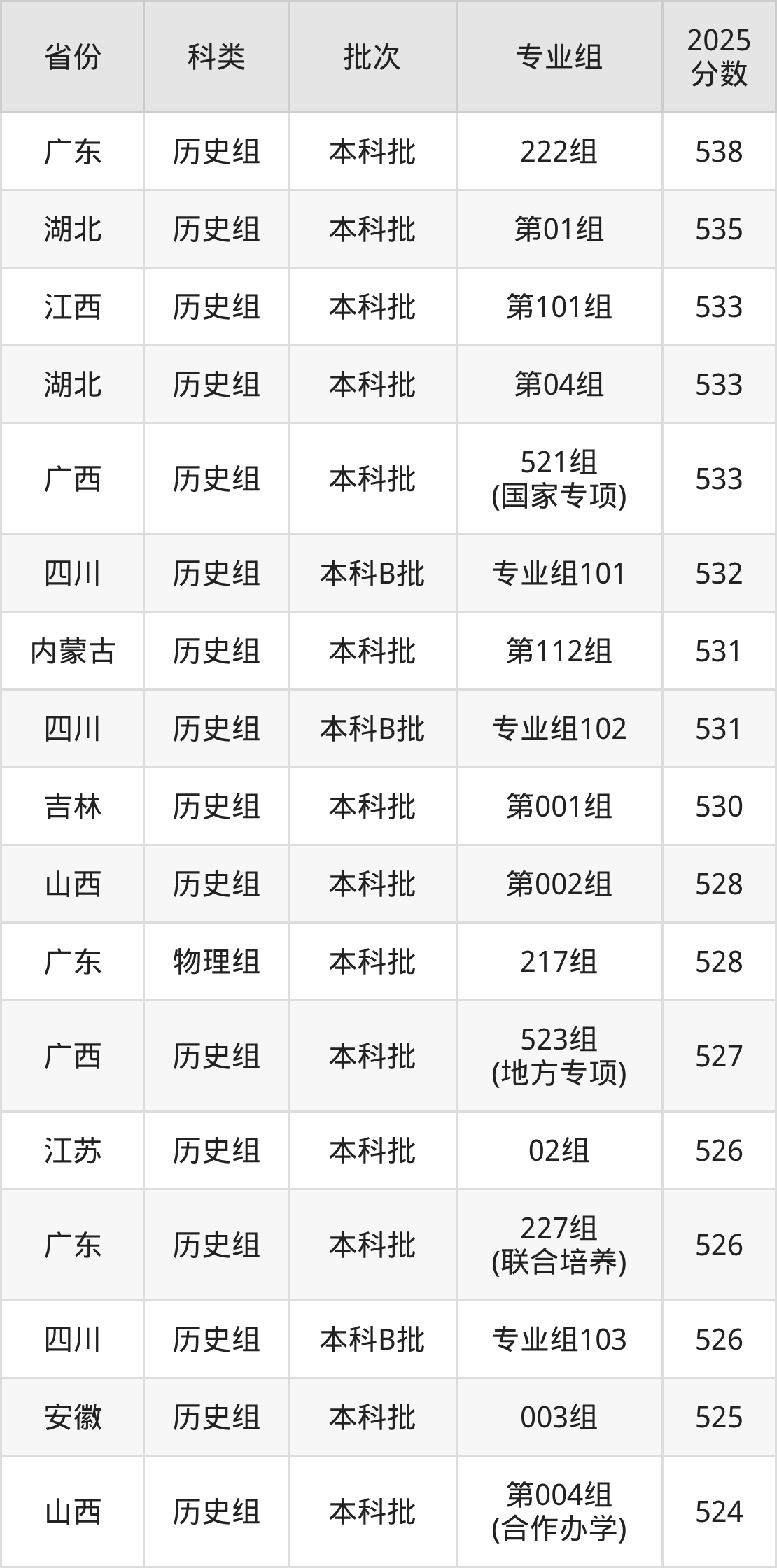 2025年广西民族大学在全国普通批次招生的录取分数范围位于392~614分之间,其中壮族自治区内分数范围为392分~543分,历史组最低分专业组为“139组”,考生434分即可报考,物理组最低分专业组为“177组”,考生392分即可报考。