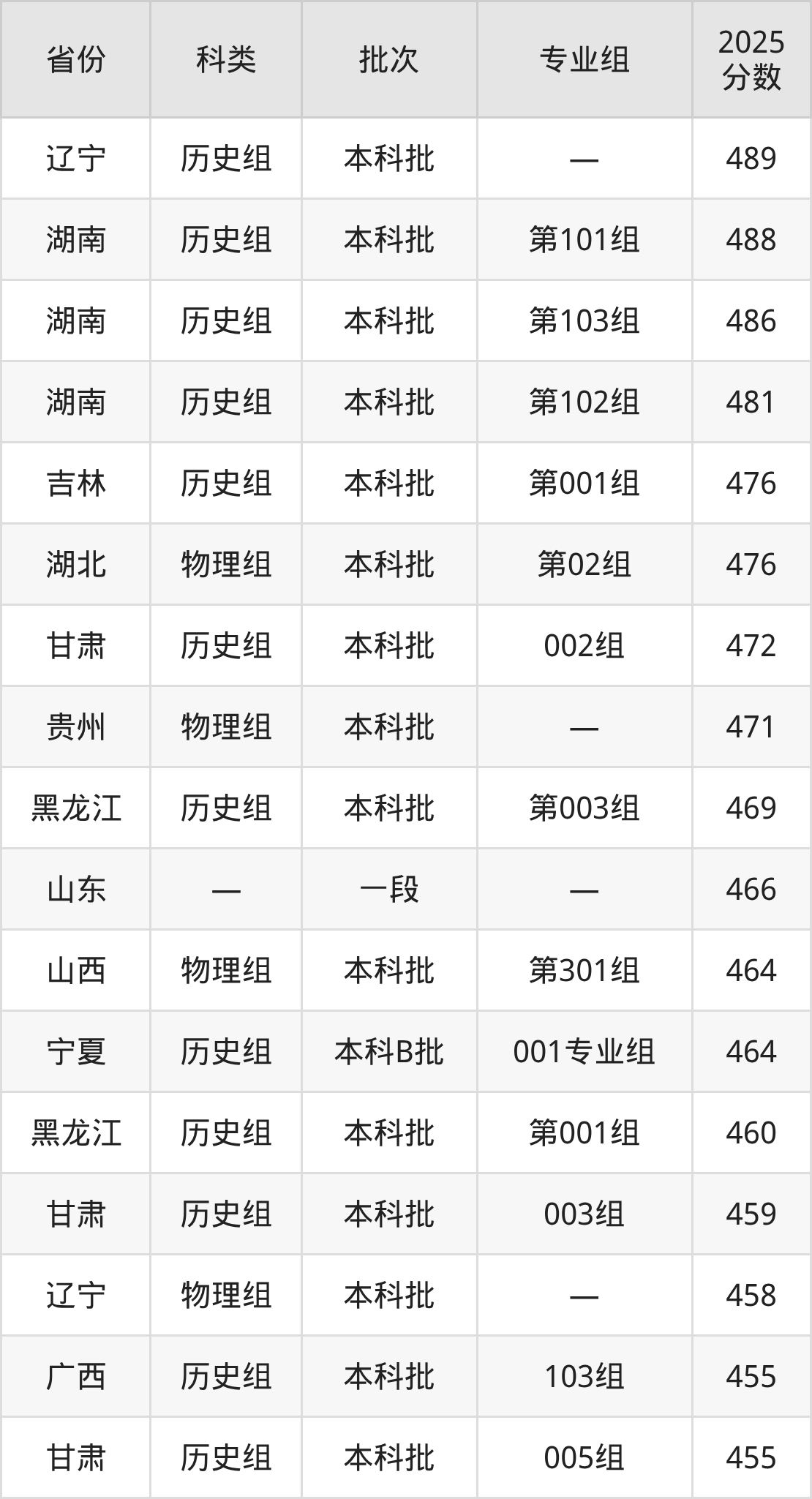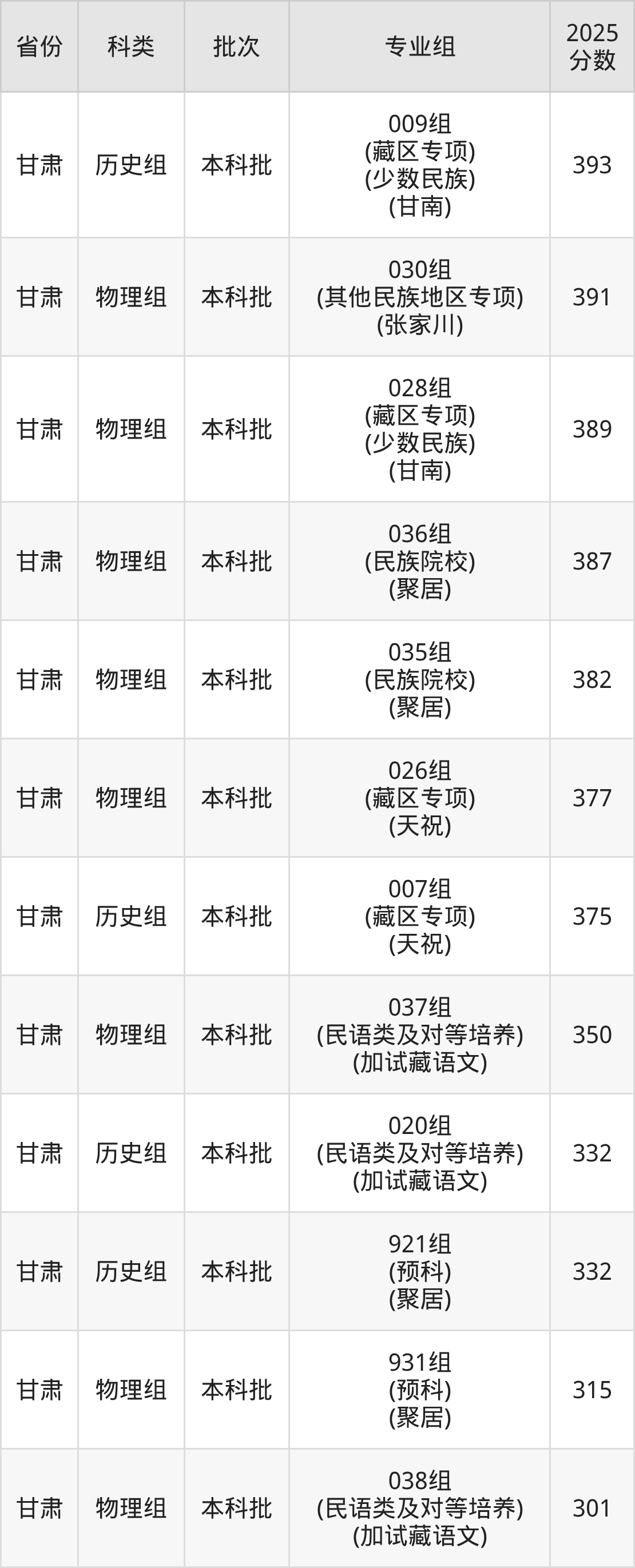 2025年甘肃民族师范学院在全国普通批次招生的录取分数范围位于301~558分之间,其中省内分数范围为301分~472分,历史组最低分专业组为“020组(民语类及对等培养)(加试藏语文)”,考生332分即可报考,物理组最低分专业组为“038组(民语类及对等培养)(加试藏语文)”,考生301分即可报考。