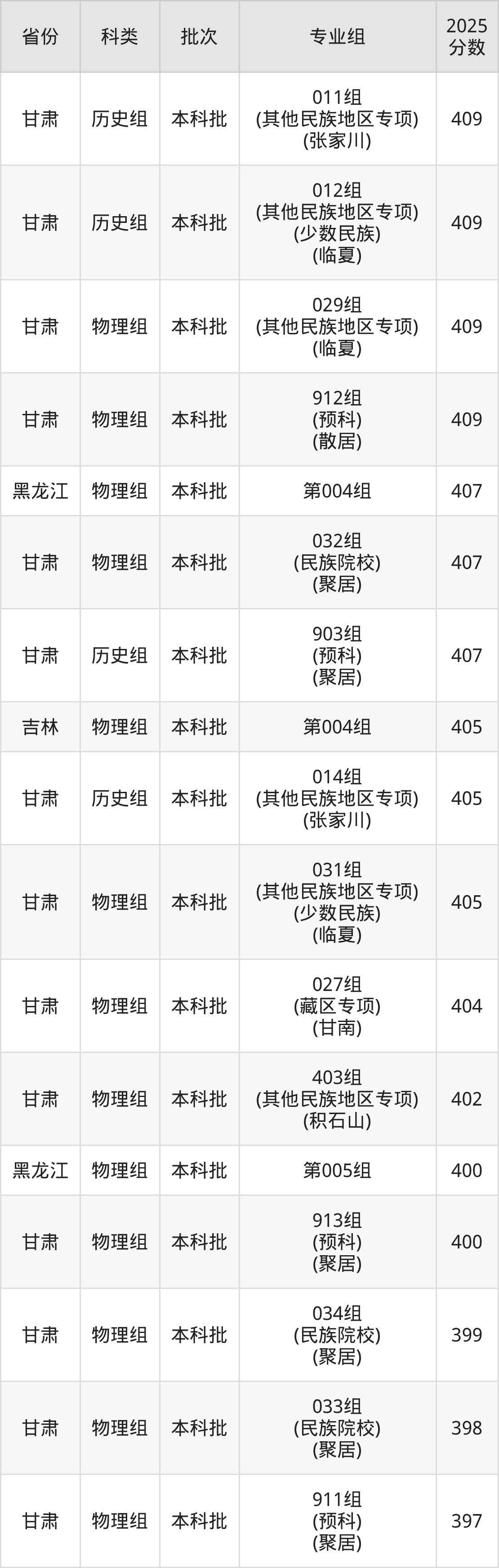 甘肃民族师范学院2026年录取分数需在高招结束官方数据公布后更新,2026届有意向报考该校的同学,可以在填报志愿时参考甘肃民族师范学院2025年录取分数线: